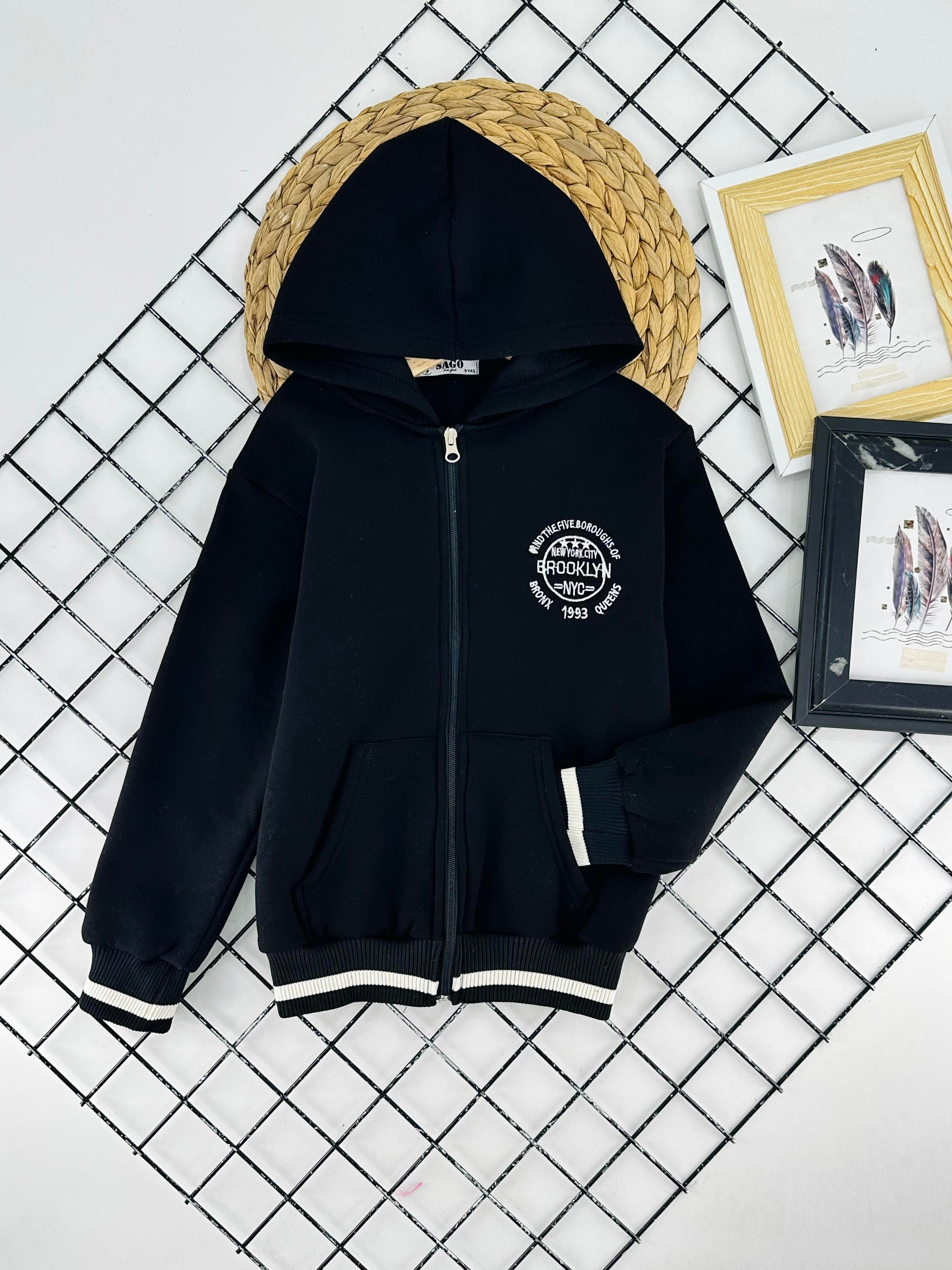 2222 Broklyn Nakışlı Erkek Çocuk Üç İplik Kapşonlu Hırka-SİYAH