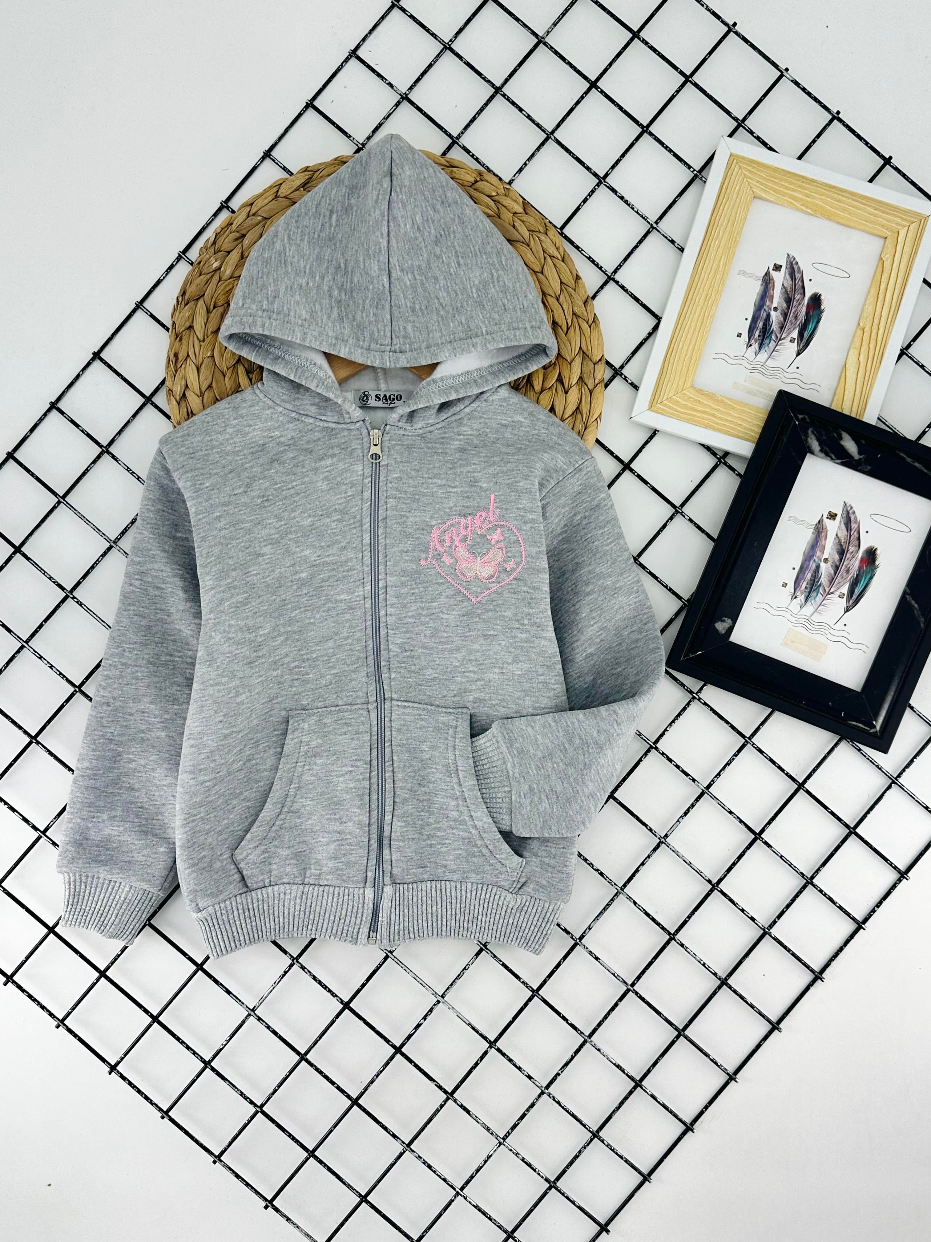 2227 Angel Kalp Nakışlı Kız Çocuk Üç İplik Hırka-GRİ 2227 Angel Kalp Nakışlı Kız Çocuk Üç İplik Hırka-PEMBE