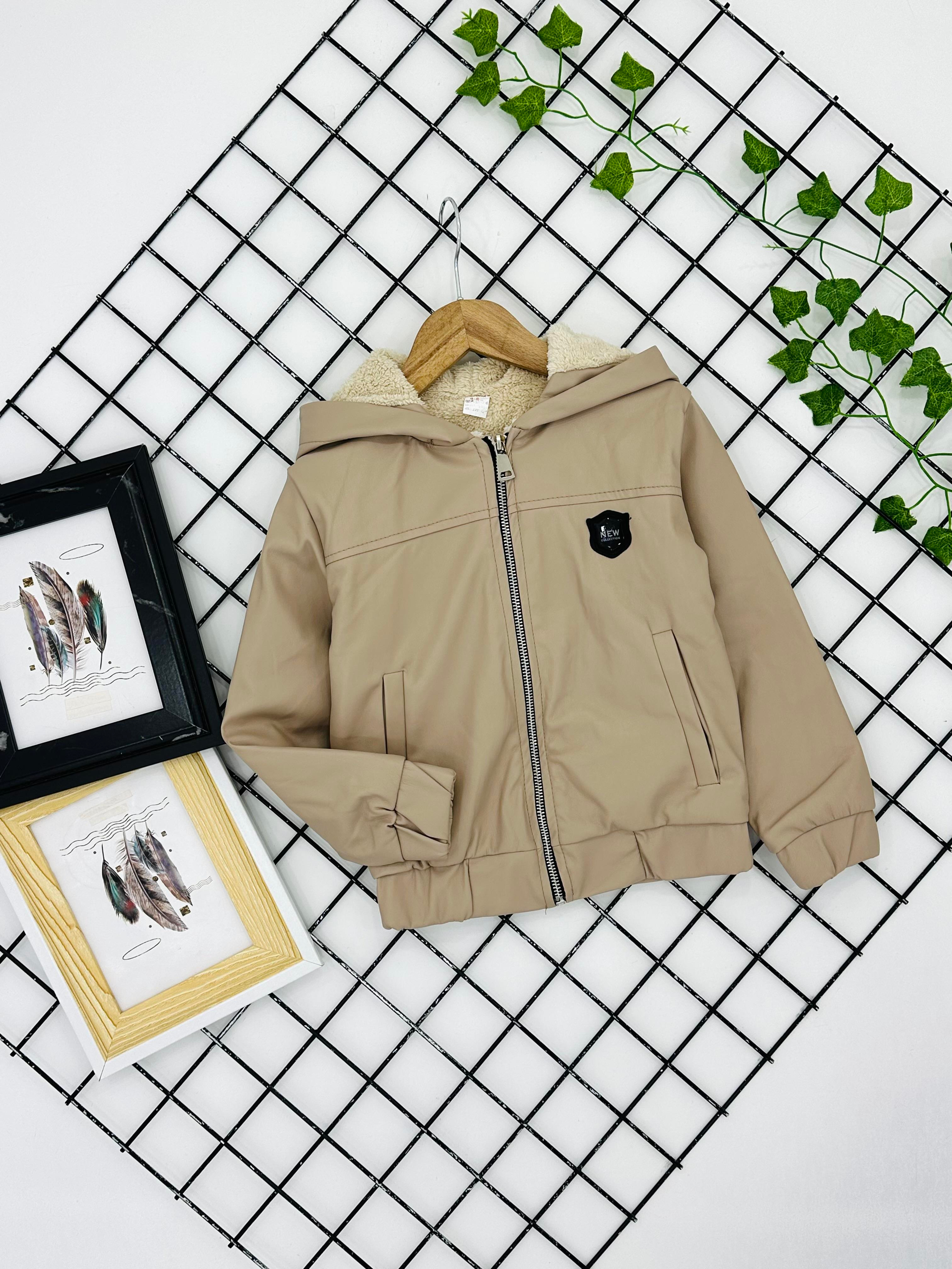 230-1 Erkek Çocuk İçi Polarlı Kapşonlu Deri Mont-BEJ