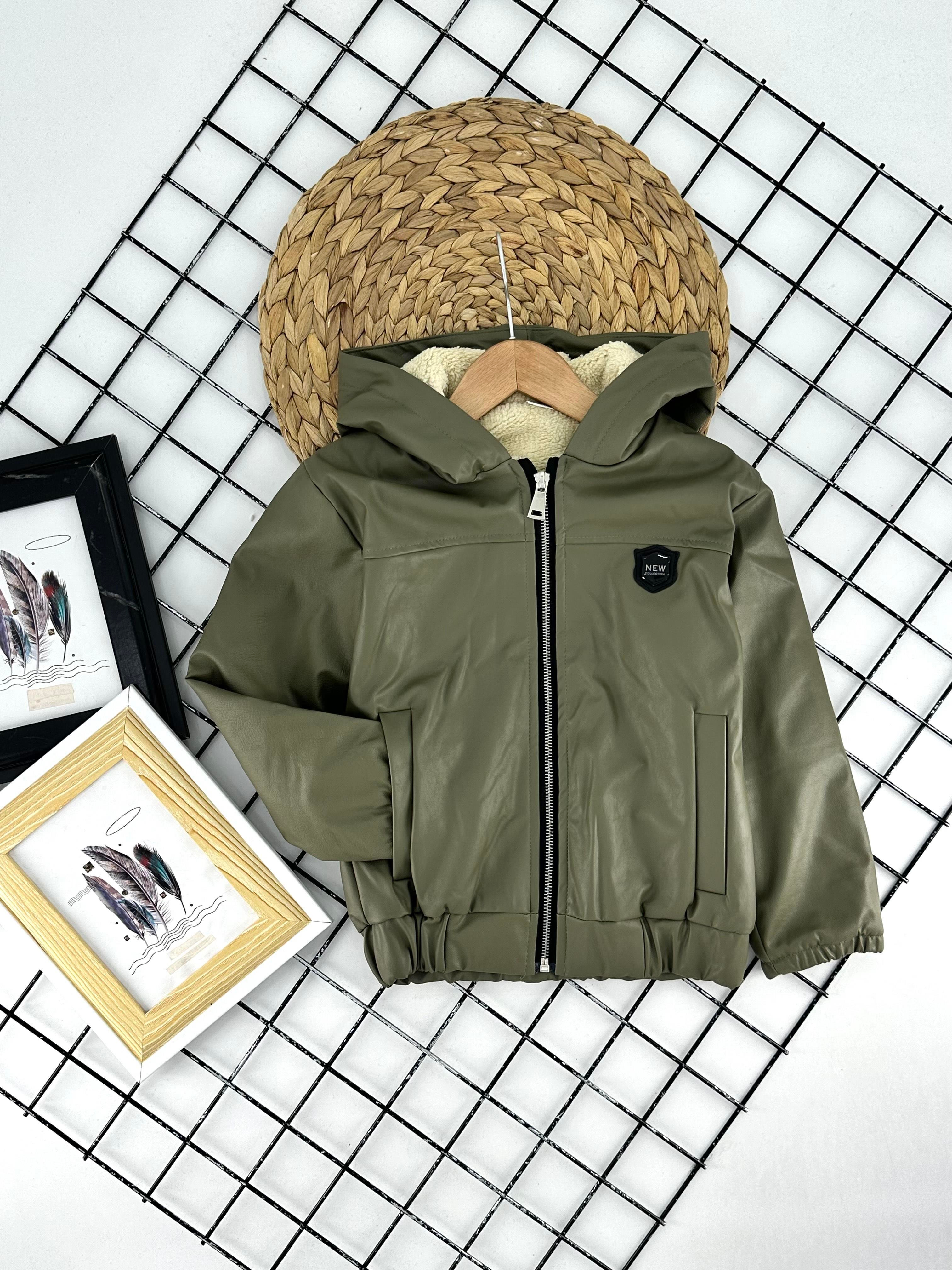 230-1 Erkek Çocuk İçi Polarlı Kapşonlu Deri Mont-HAKİ YEŞİLİ