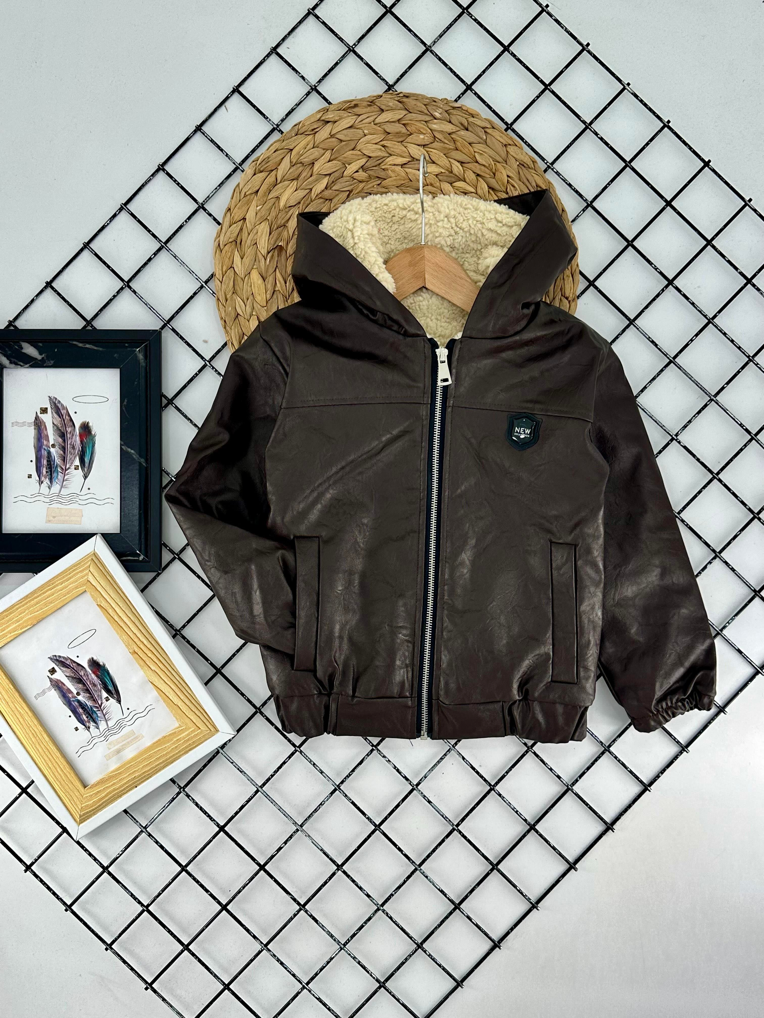 230-1 Erkek Çocuk İçi Polarlı Kapşonlu Deri Mont-KOYU KAHVE