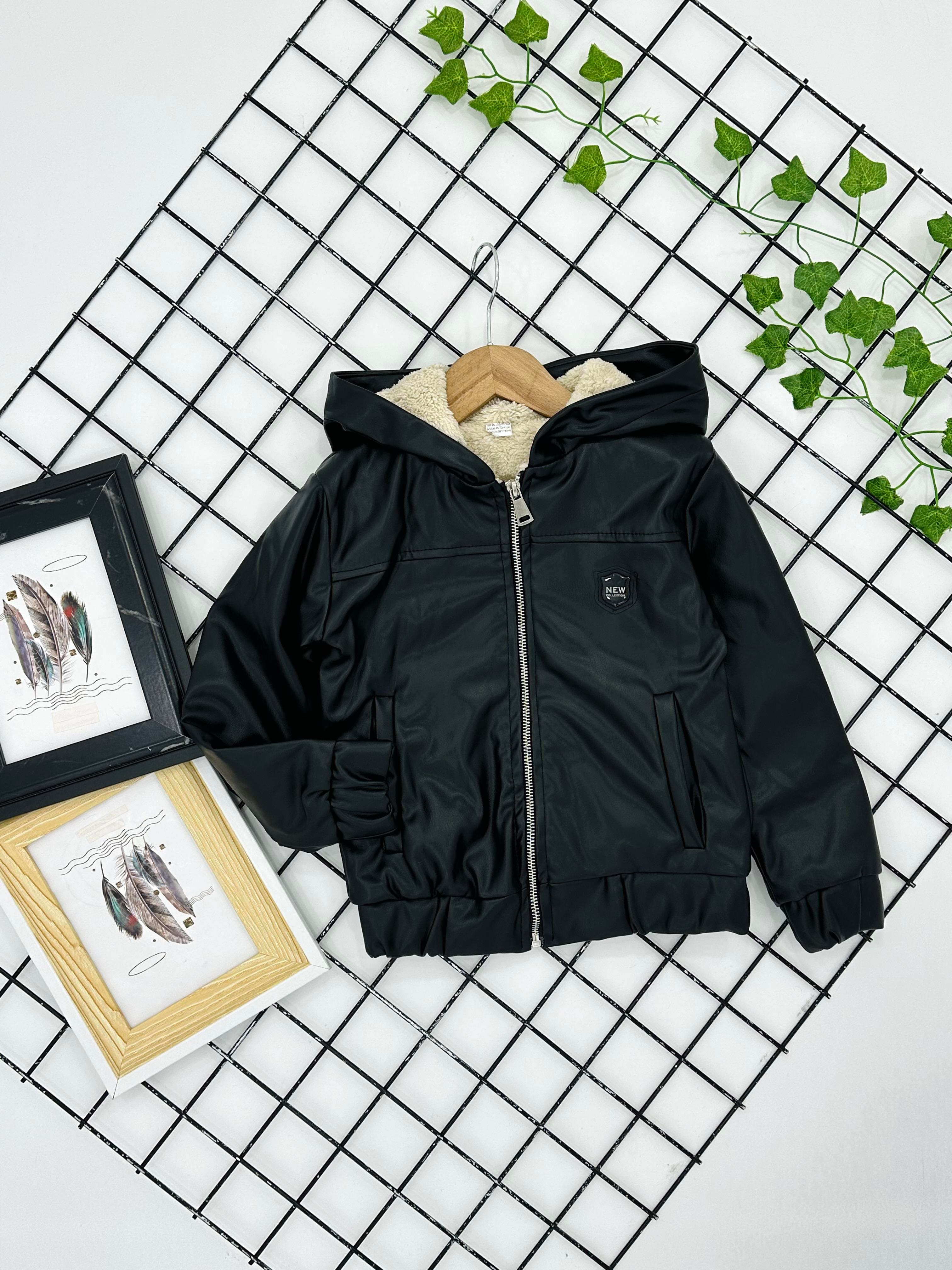 230-1 Erkek Çocuk İçi Polarlı Kapşonlu Deri Mont-SİYAH