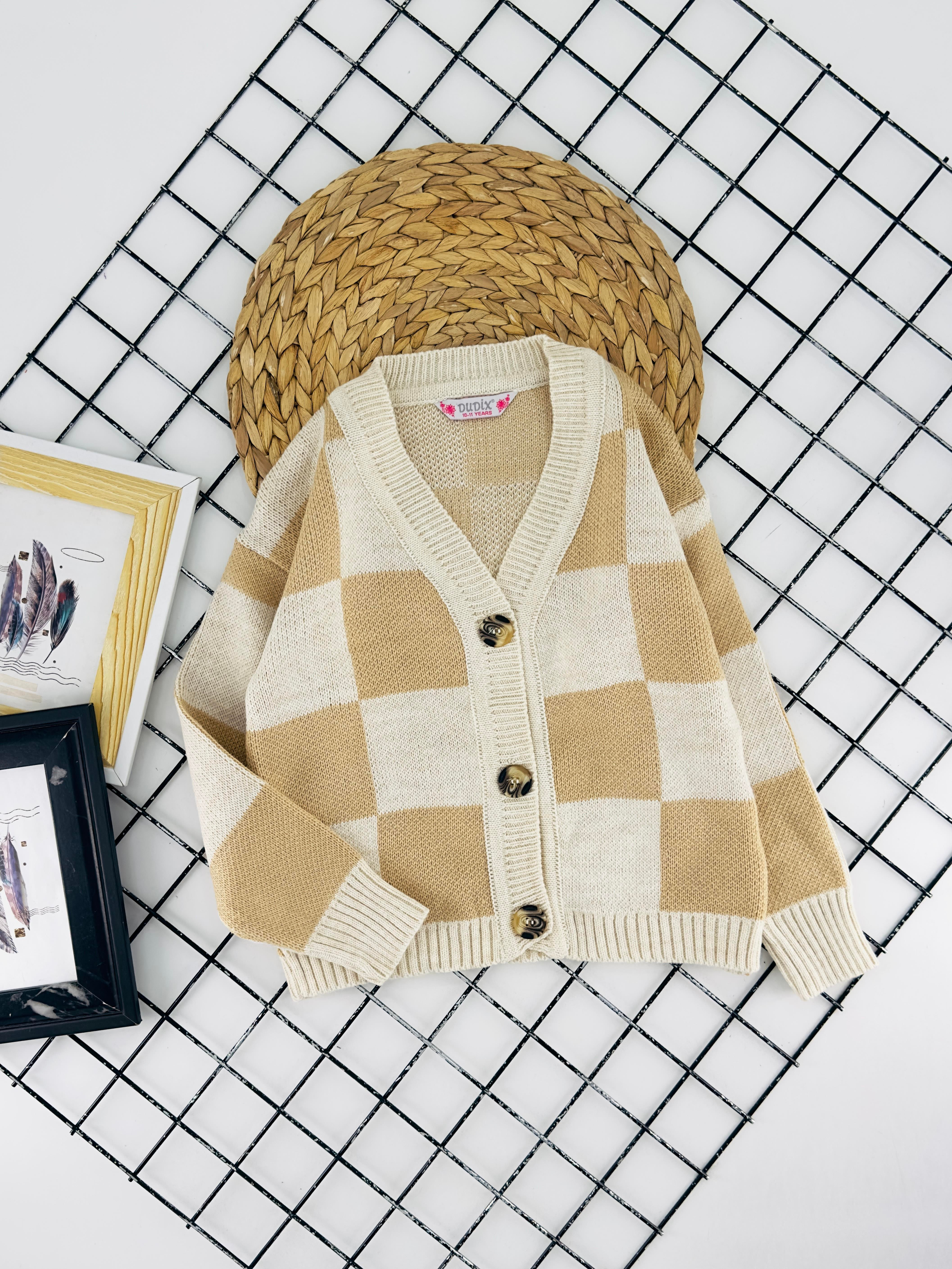 23352 Kare Desenli Kız Çocuk Triko Hırka-BEJ