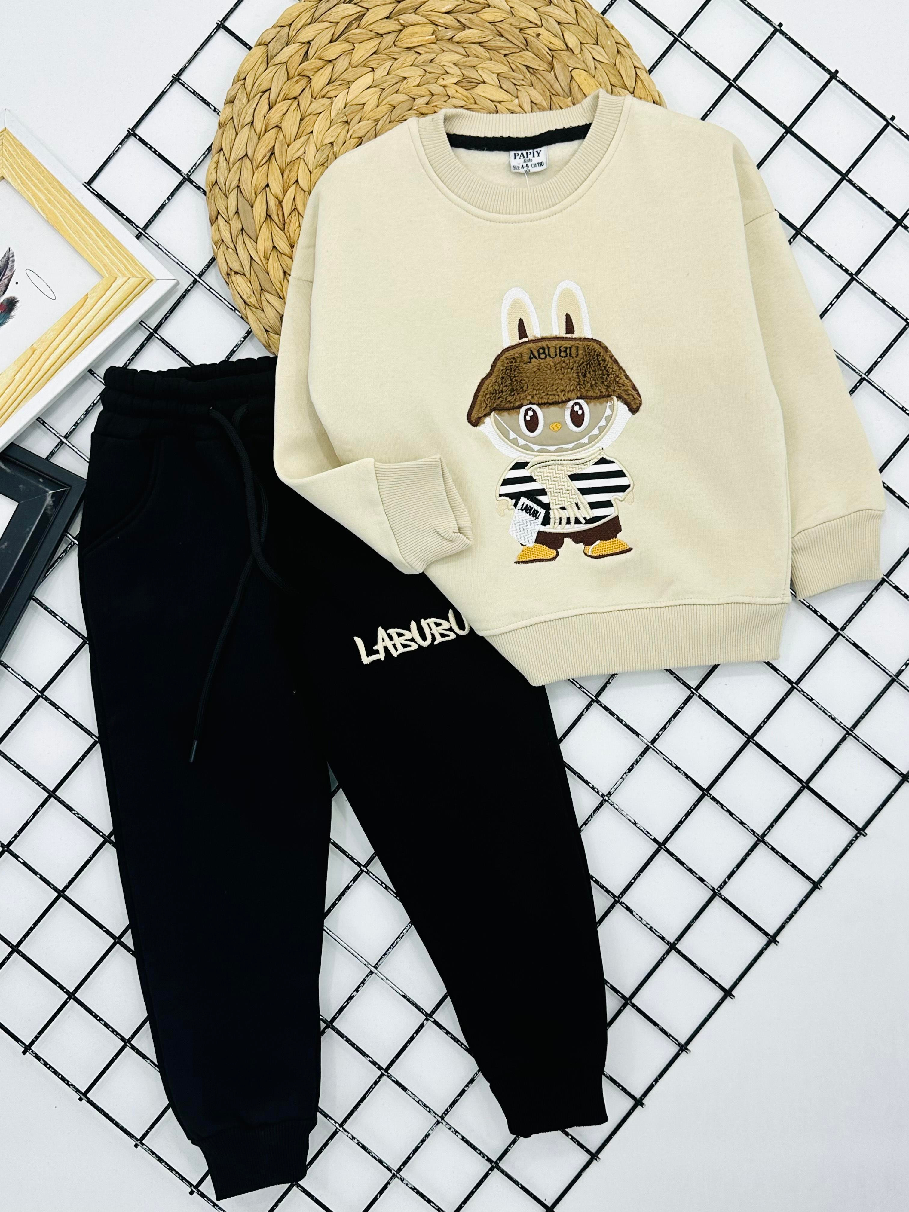 2434 Lbb Nakışlı 3 İplik Şardonlu Erkek Çocuk Takım-BEJ