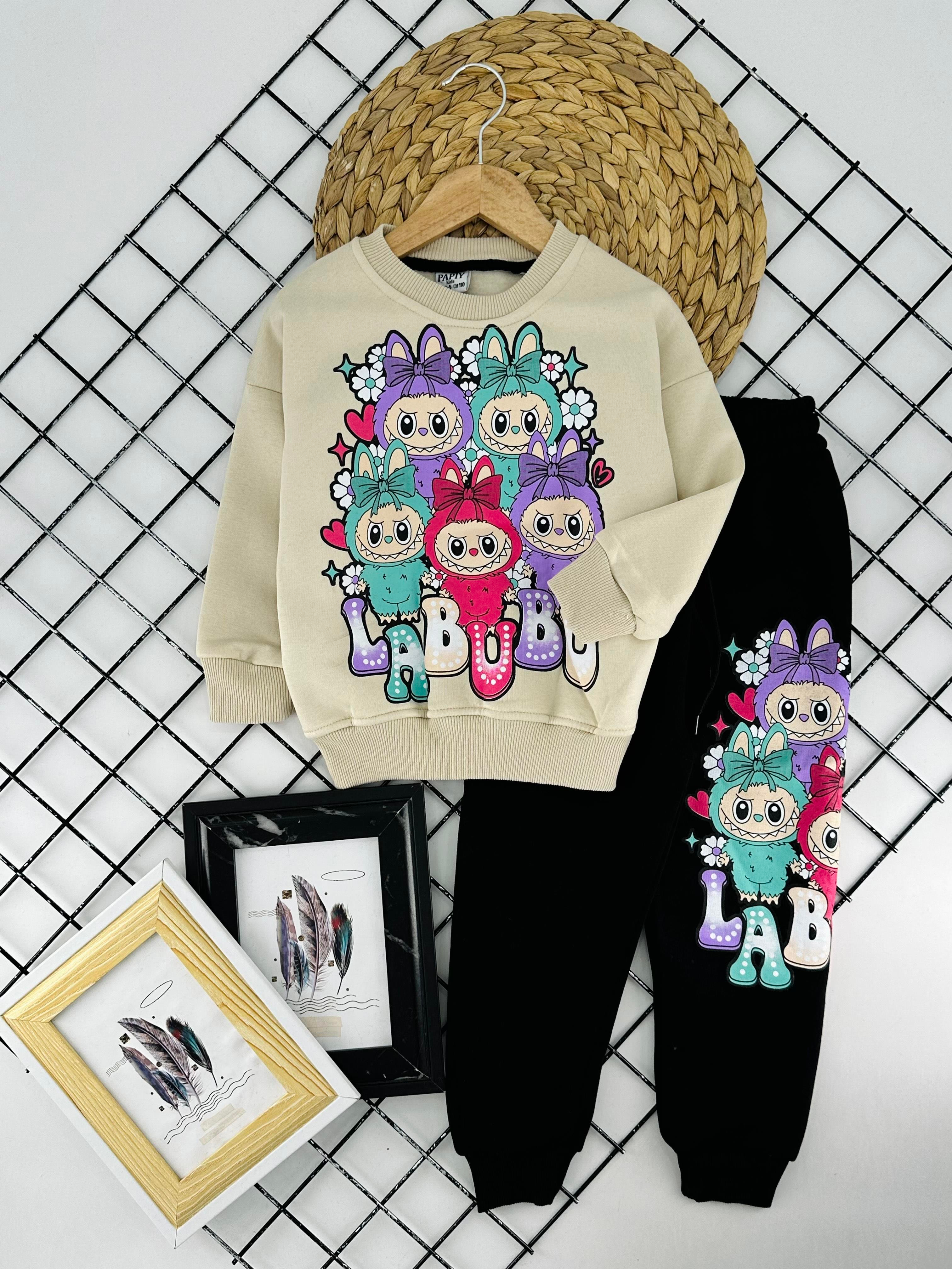 2441-1 Çiçekli Lbb Baskılı Kız Çocuk Üç İplik Şardonlu Kız Çocuk Takım-BEJ
