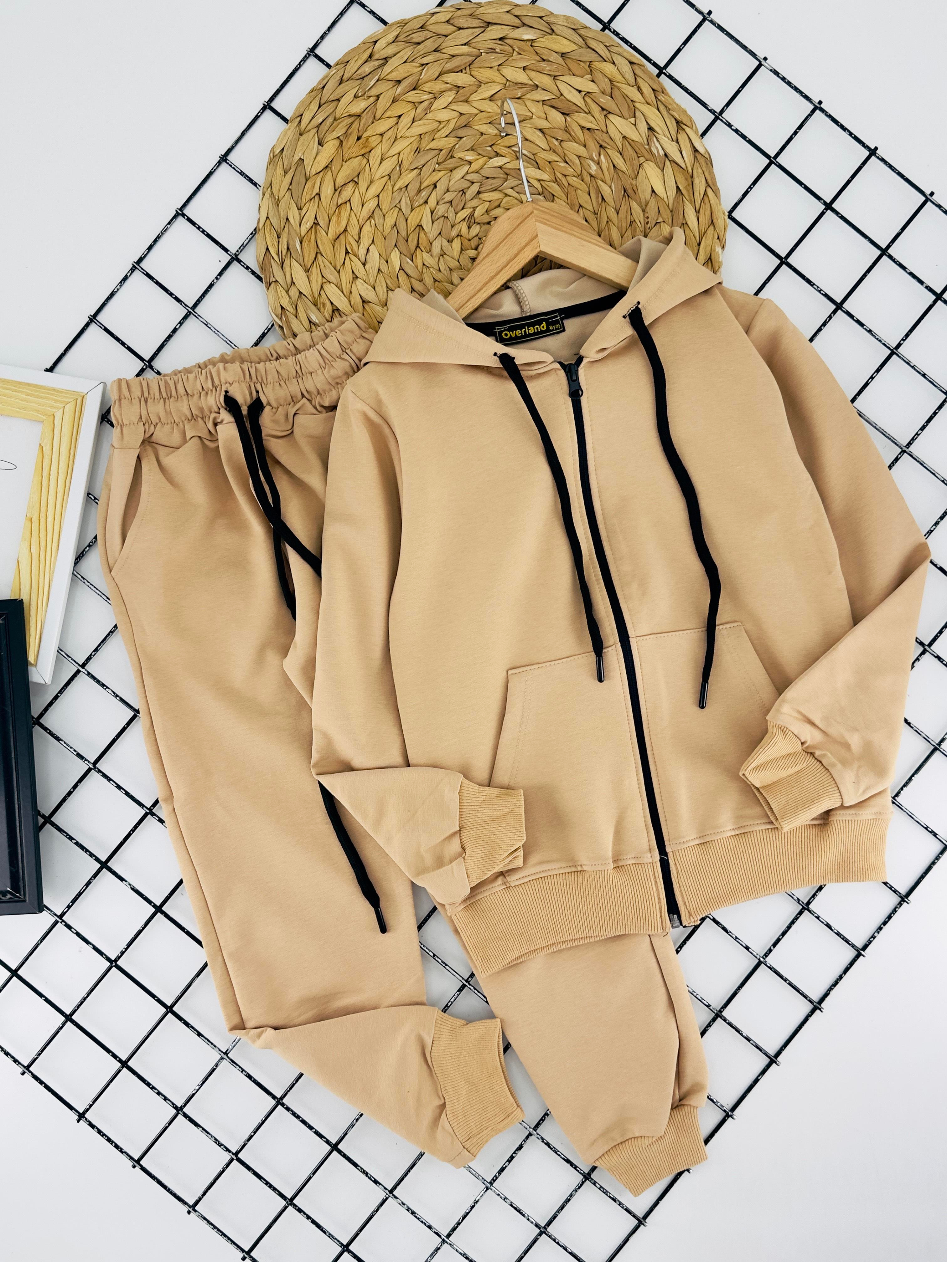 280-2 Kanguru Cepli Kapşonlu Fermuarlı İki İplik Erkek Çocuk Takım-BEJ