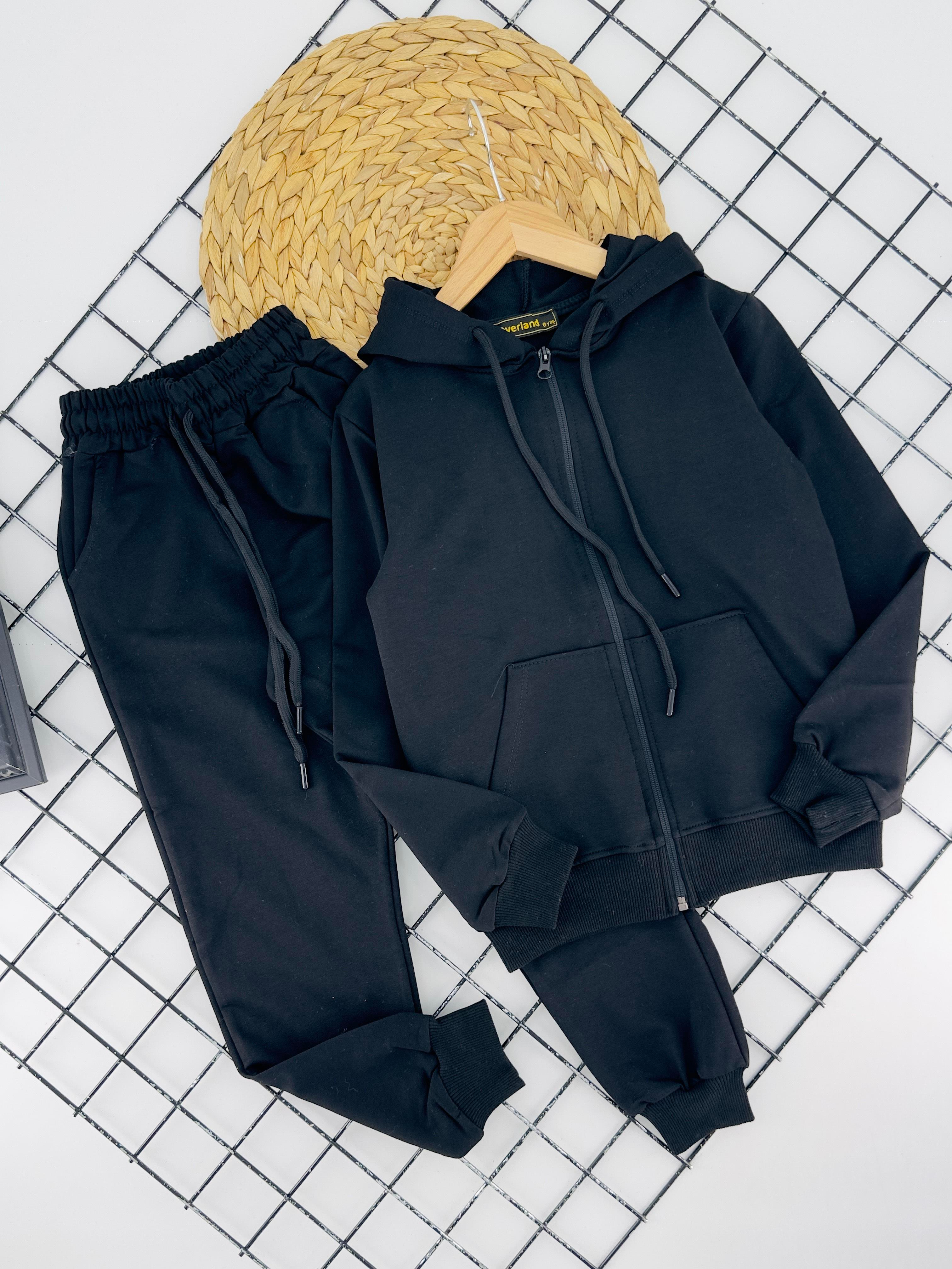 280-2 Kanguru Cepli Kapşonlu Fermuarlı İki İplik Erkek Çocuk Takım-SİYAH