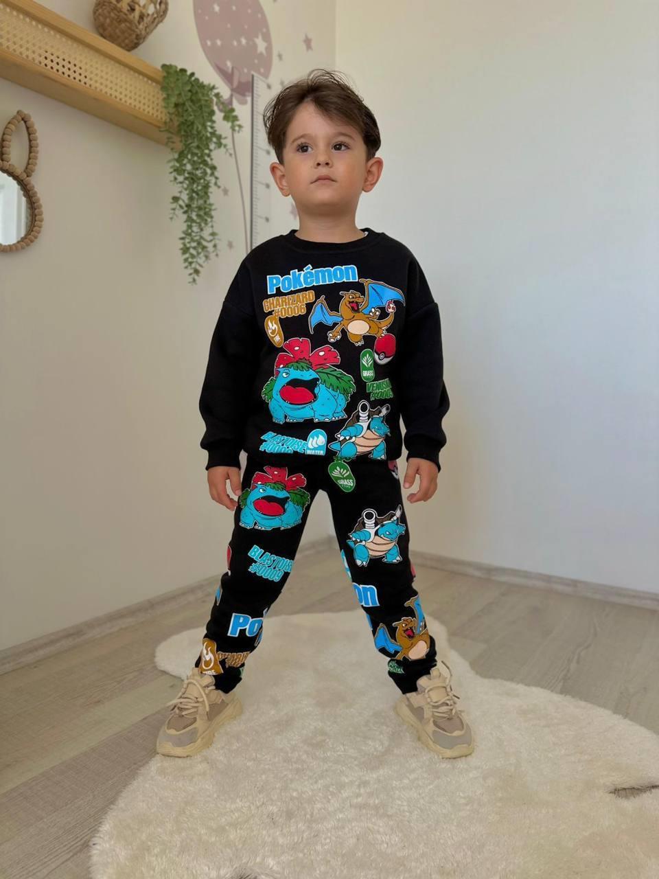 2912 Pkmn Baskılı Erkek Çocuk Üç İplik Şardonlu Takım-SİYAH