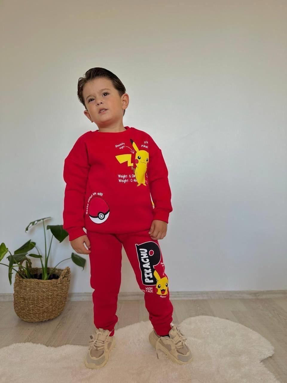 2932 Pk Yazılı Erkek Çocuk Üç İplik Şardonlu Takım-KIRMIZI