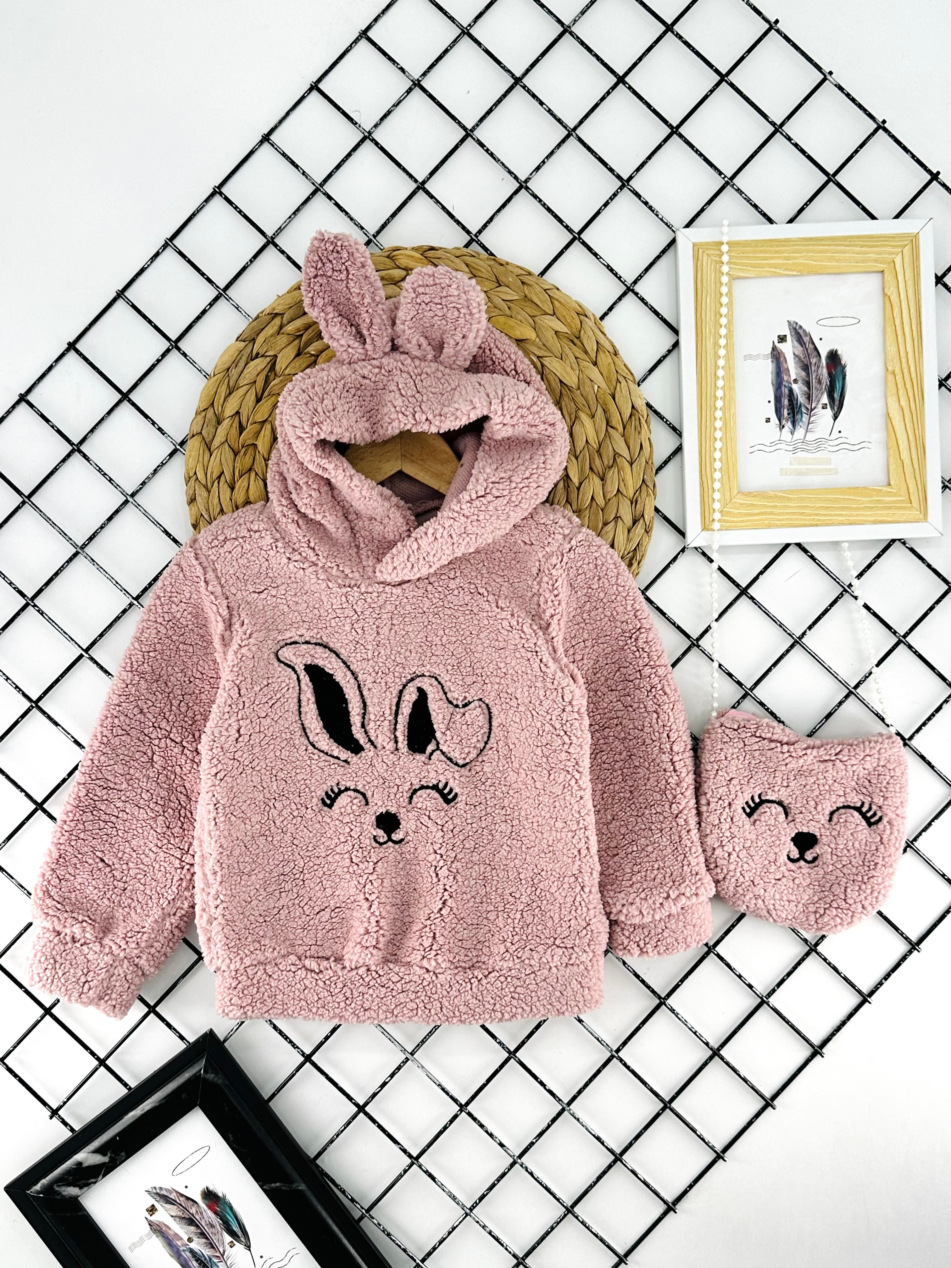 3010-1 Tavşan Nakışlı Çantalı Kız Çocuk Polar Sweat-GÜL KURUSU