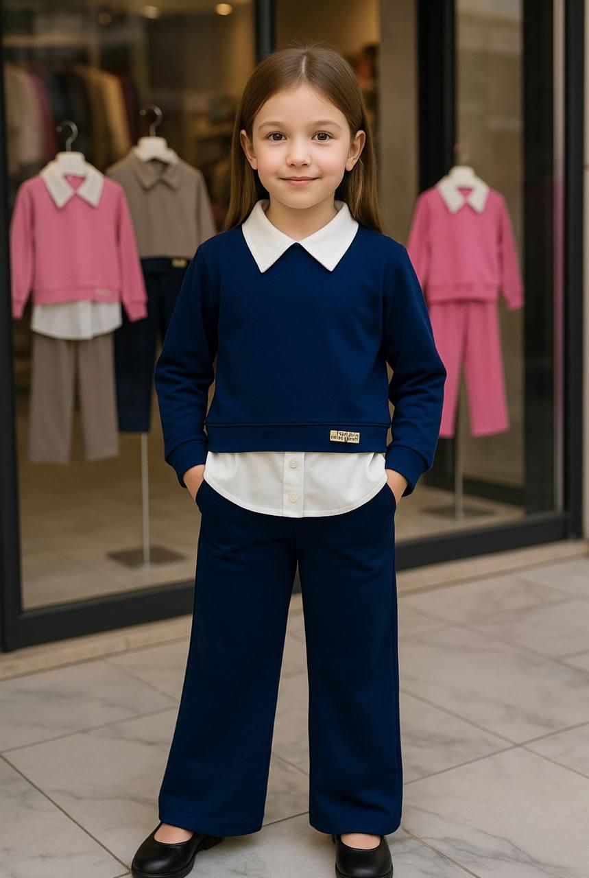 3055 Yakalı Oysho Kumaş İki İplik İspayol Paça Kız Çocuk Takım-LACİVERT