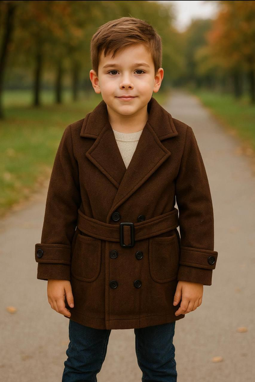 3086-1 Düğmeli Kuşaklı Erkek Çocuk Kaşe Kaban-KAHVE