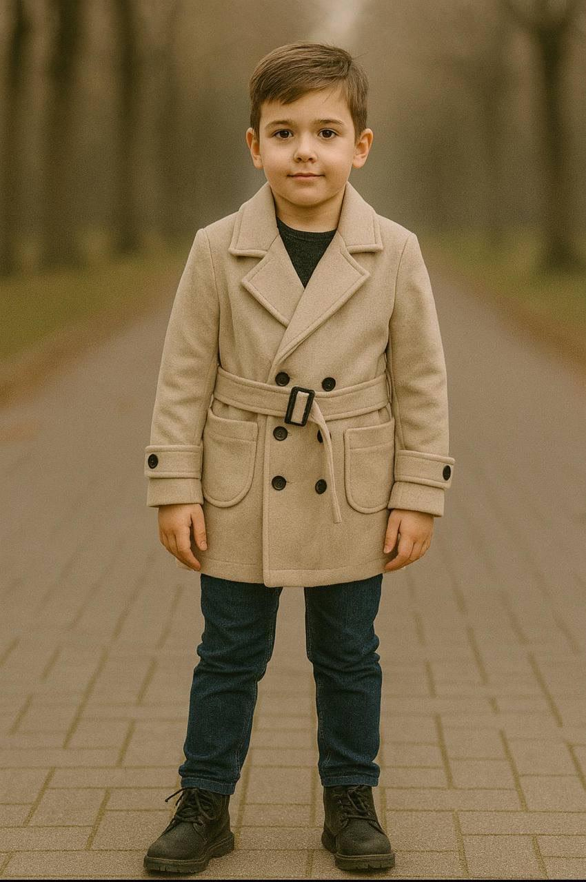 3086-1 Düğmeli Kuşaklı Erkek Çocuk Kaşe Kaban-KREM