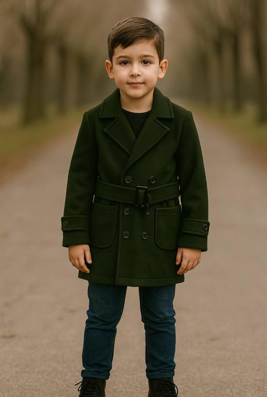 3086-1 Düğmeli Kuşaklı Erkek Çocuk Kaşe Kaban-YEŞİL