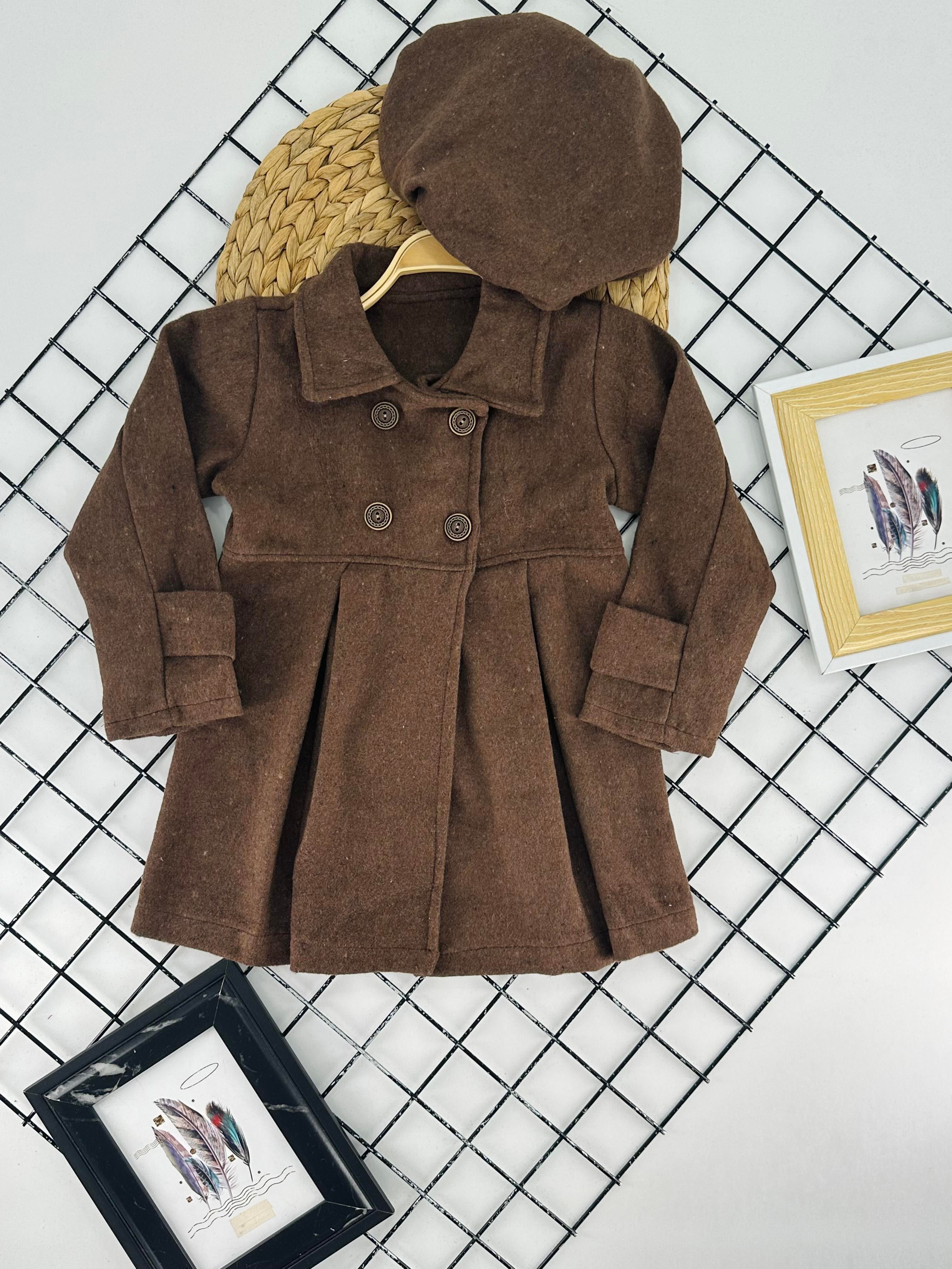 3116 Düğmeli Şapkalı Kız Çocuk Kaşe Kaban-KAHVE