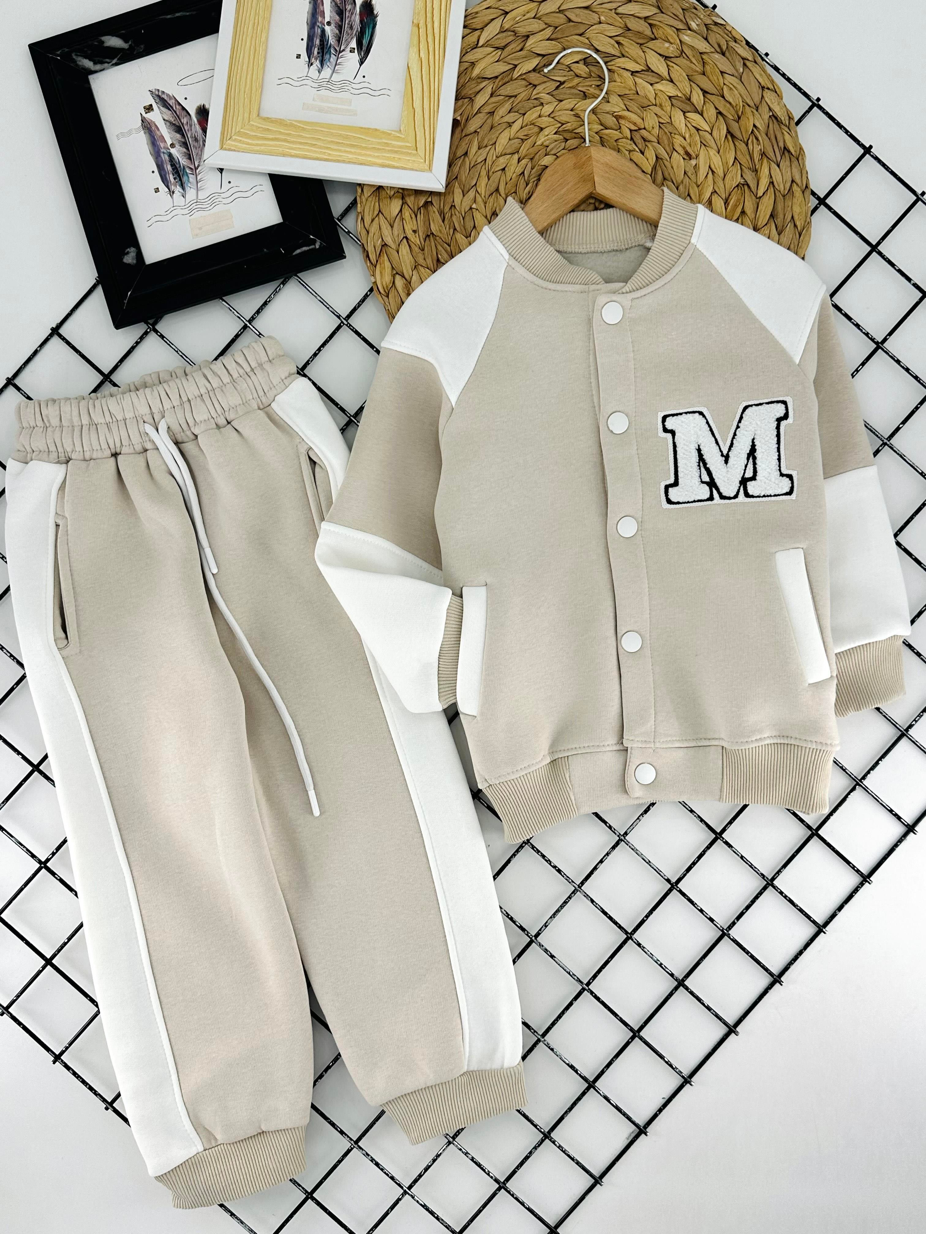 3185 Çıtçıtlı M Nakışlı 3 İplik Şardonlu Unısex Çocuk Takım-BEJ
