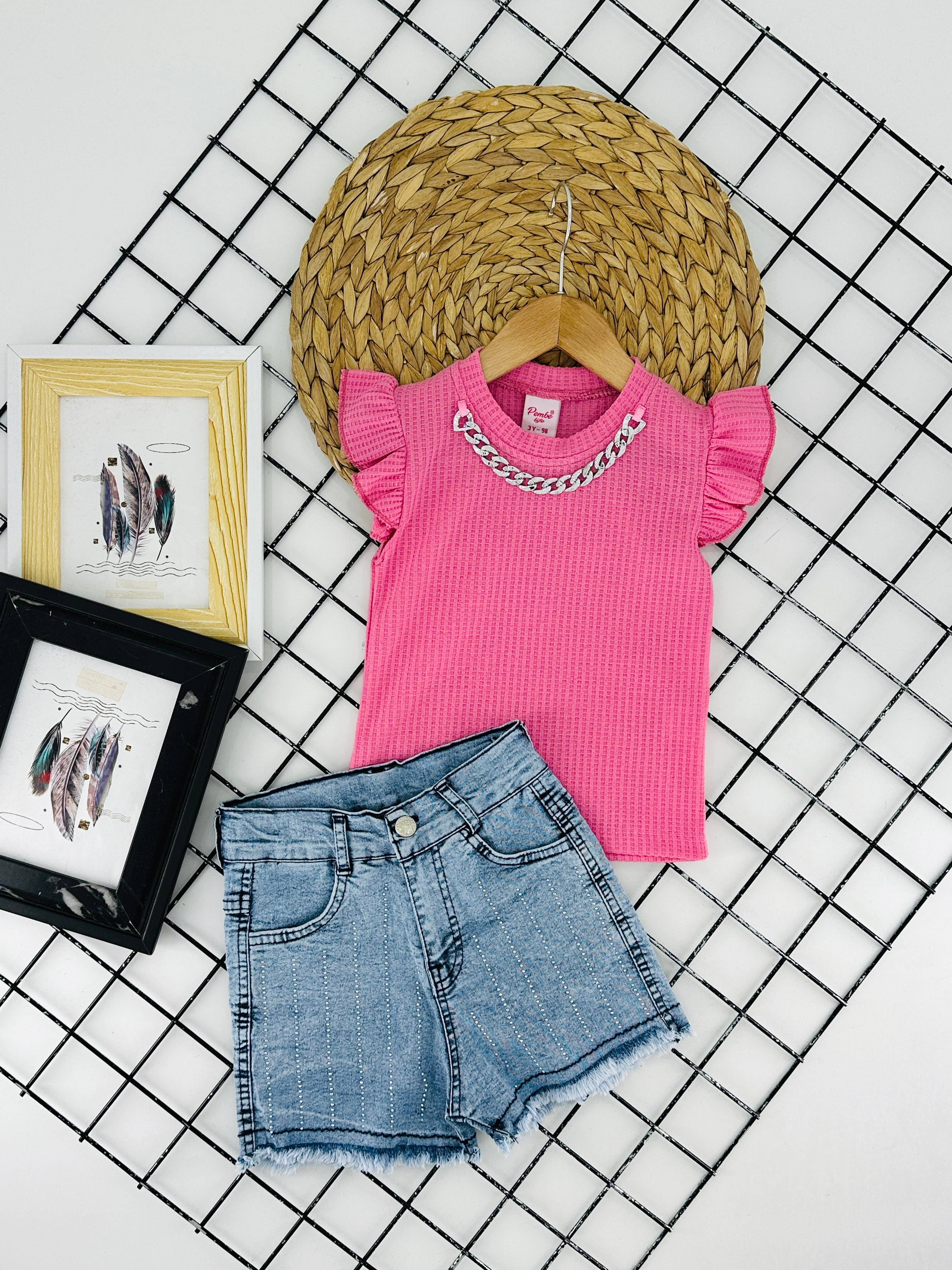3242 Fırfırlı Zincir Detaylı Kız Çocuk Kot Şortlu Takım-PEMBE