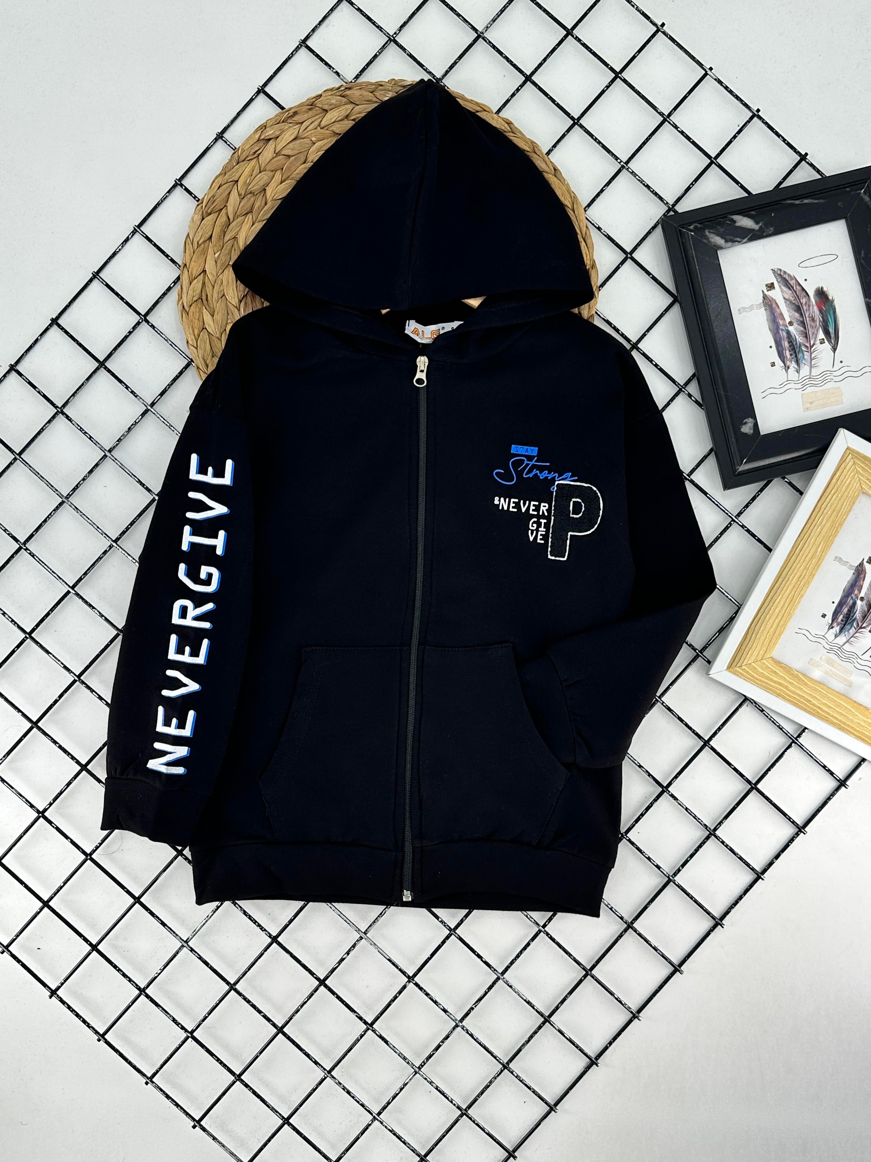 324675 Never P Yazılı Kapşonlu İki İplik Şardonlu Erkek Çocuk Hırka-SİYAH