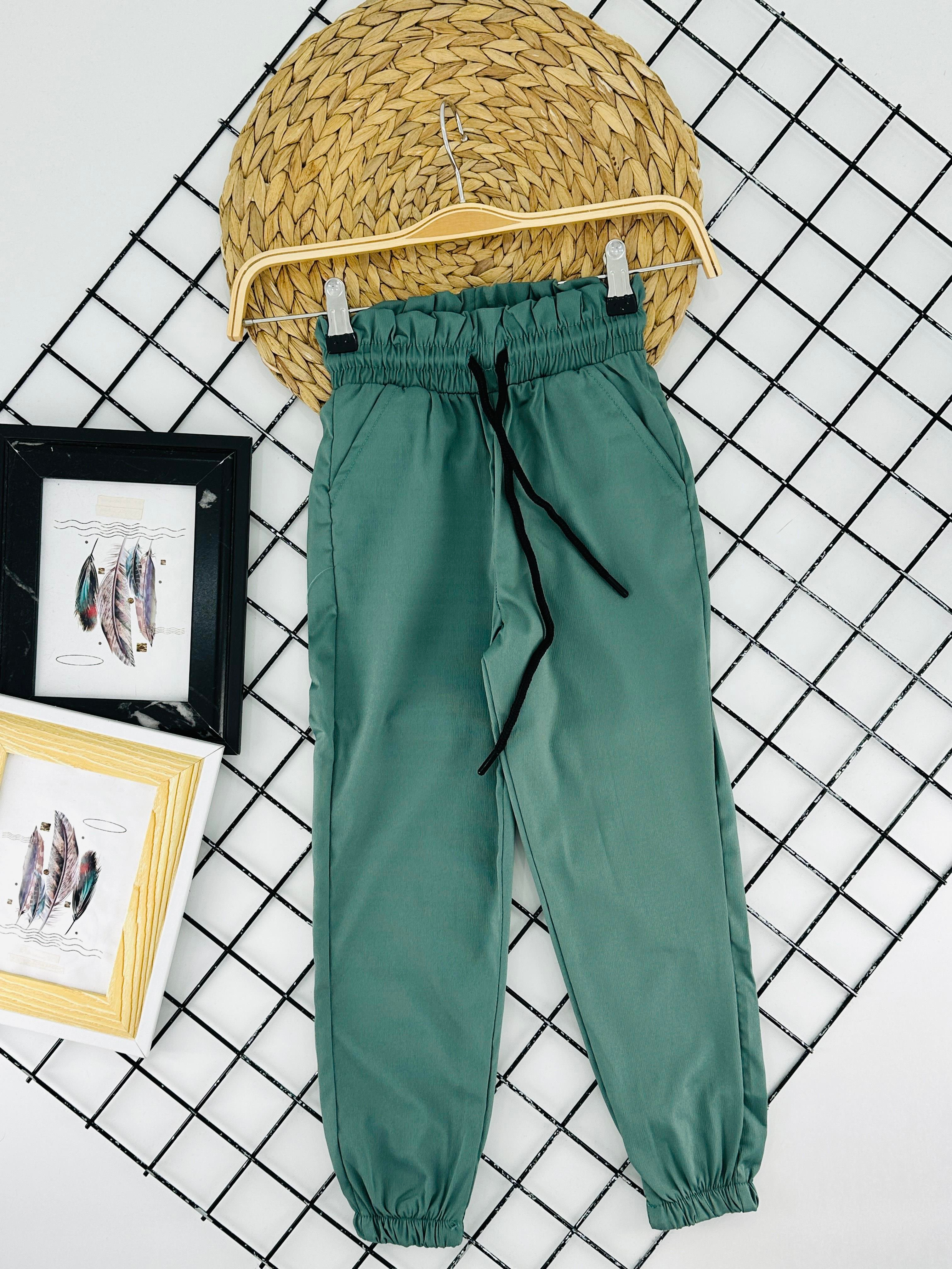 3843-1 Bel Lastikli Altı Lastikli Kız Çocuk Burgaz Kumaş Pantolon-YEŞİL