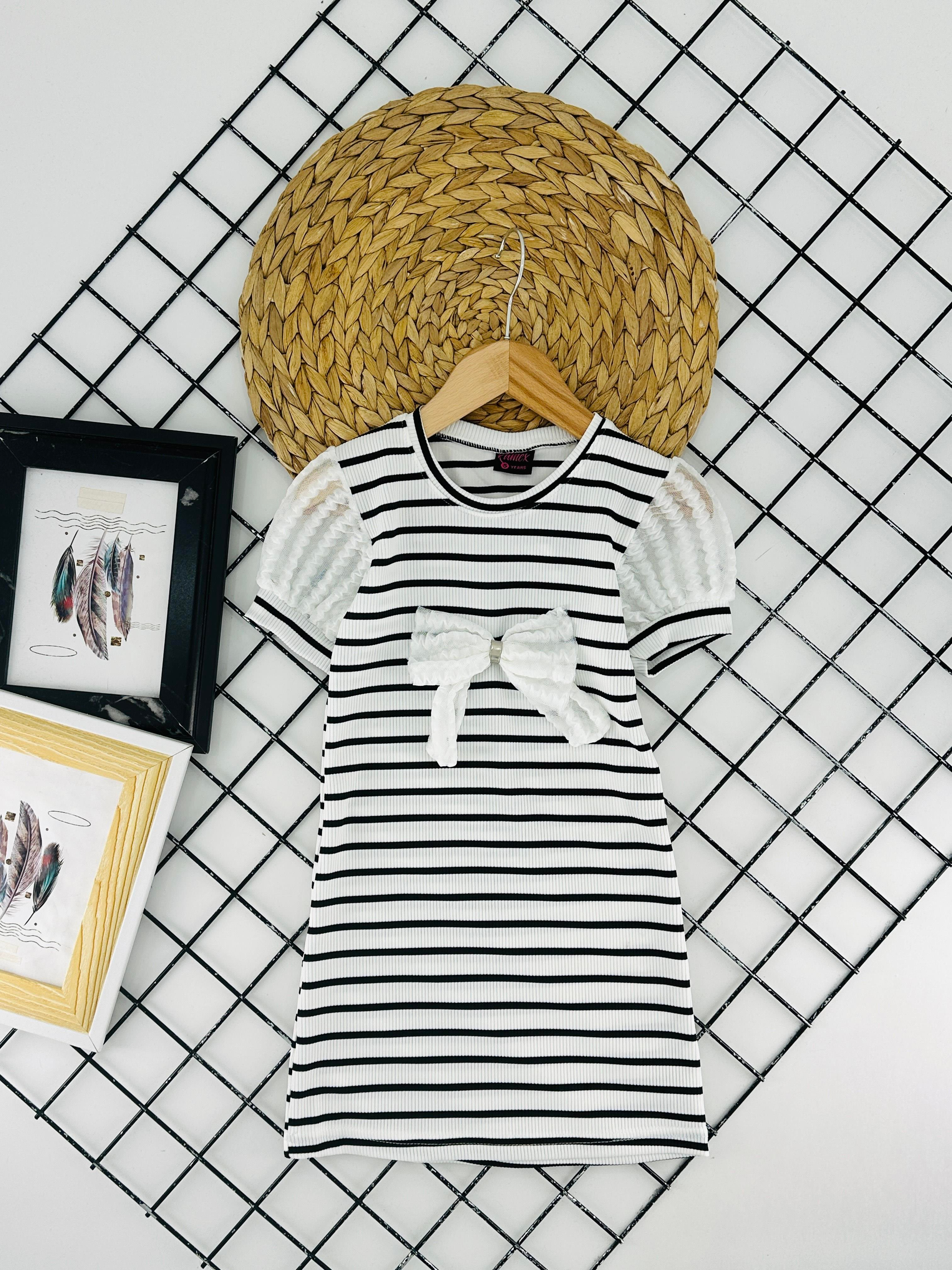 4024 Önü Fiyonklu Çizgili Kız Çocuk Elbise (5/8 Yaş)-SİYAH