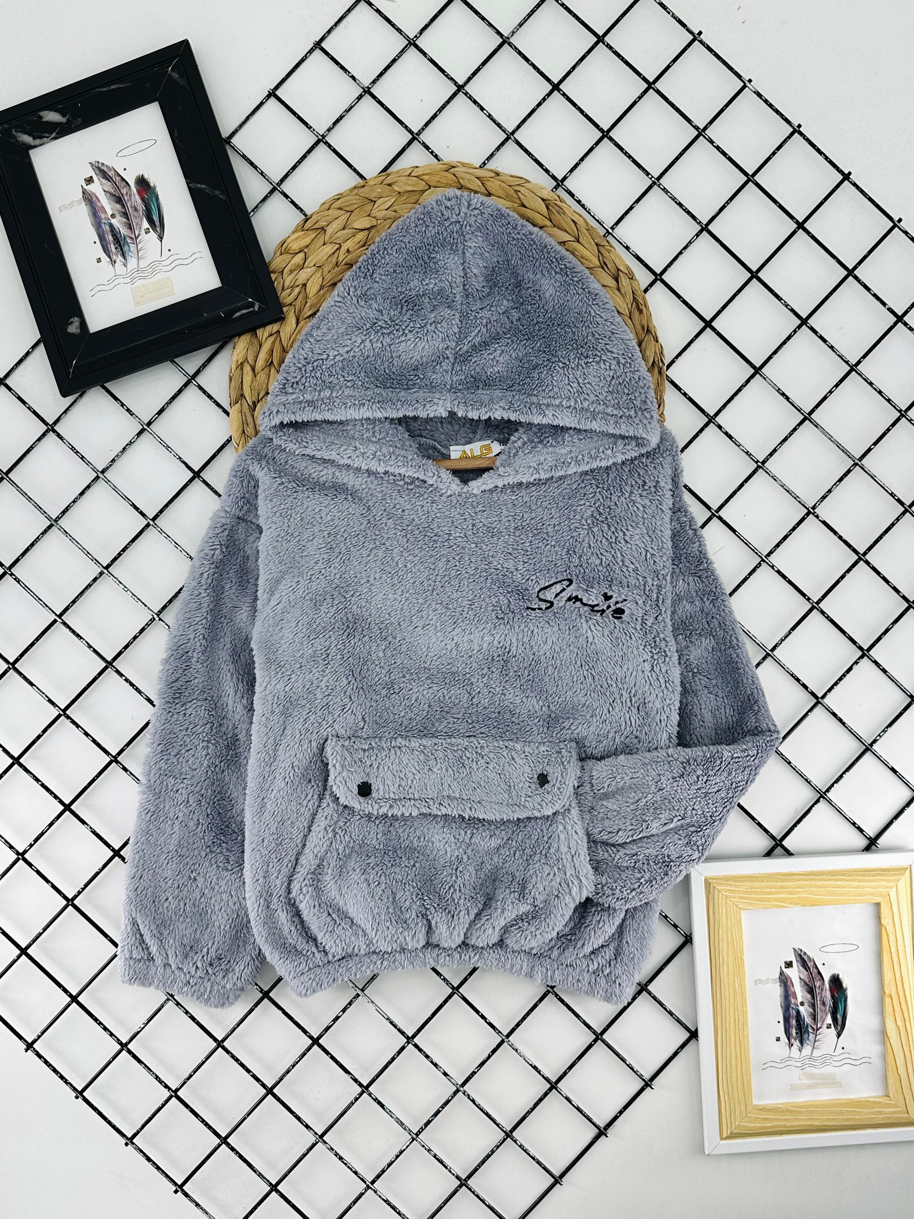 413720 önü Cep Detaylı Smıle Yazılı Unısex Peluş Sweat-GRİ