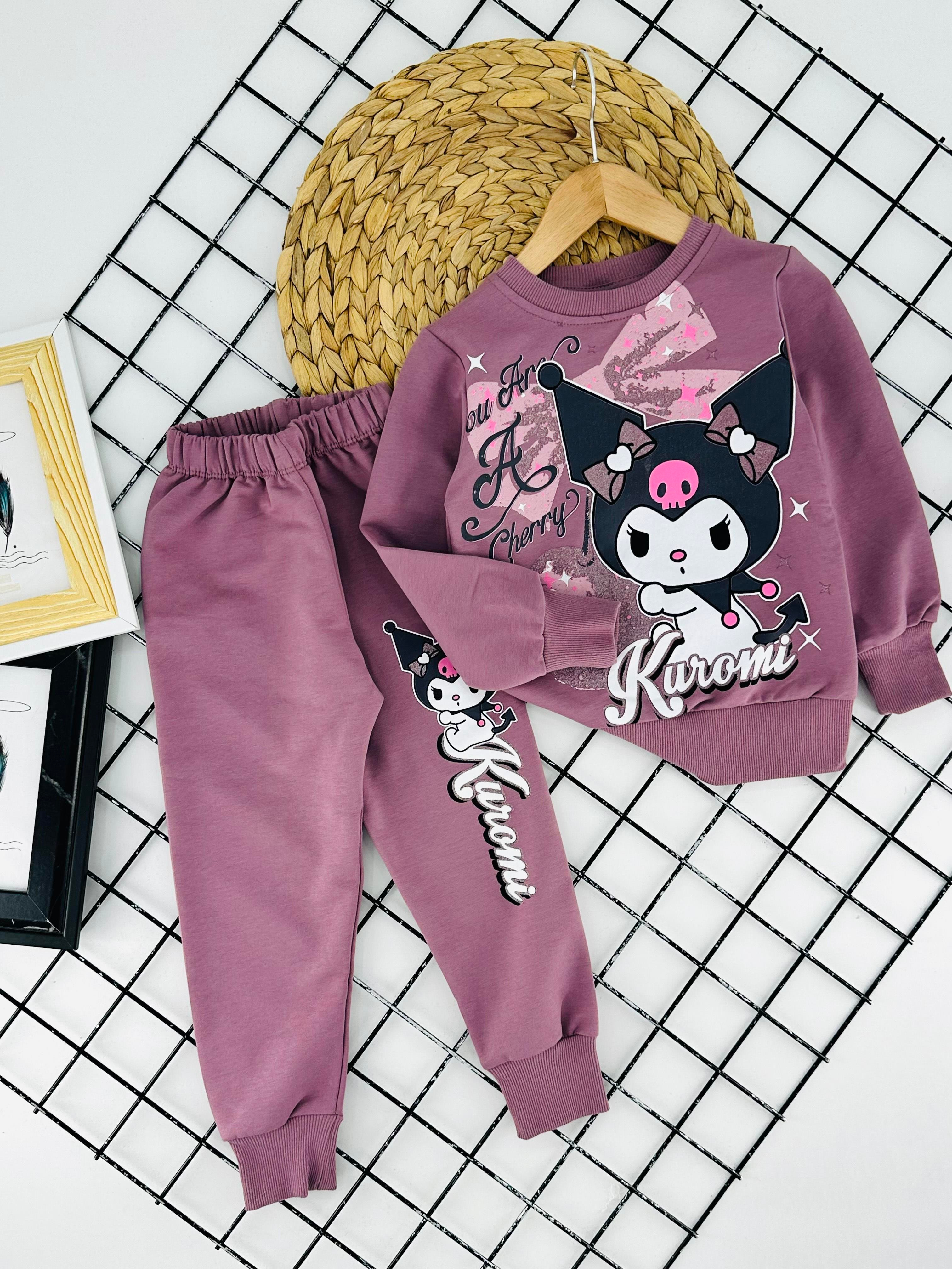 4949 Krm Kalp Baskılı İkili Kız Çocuk Takım-MÜRDÜM