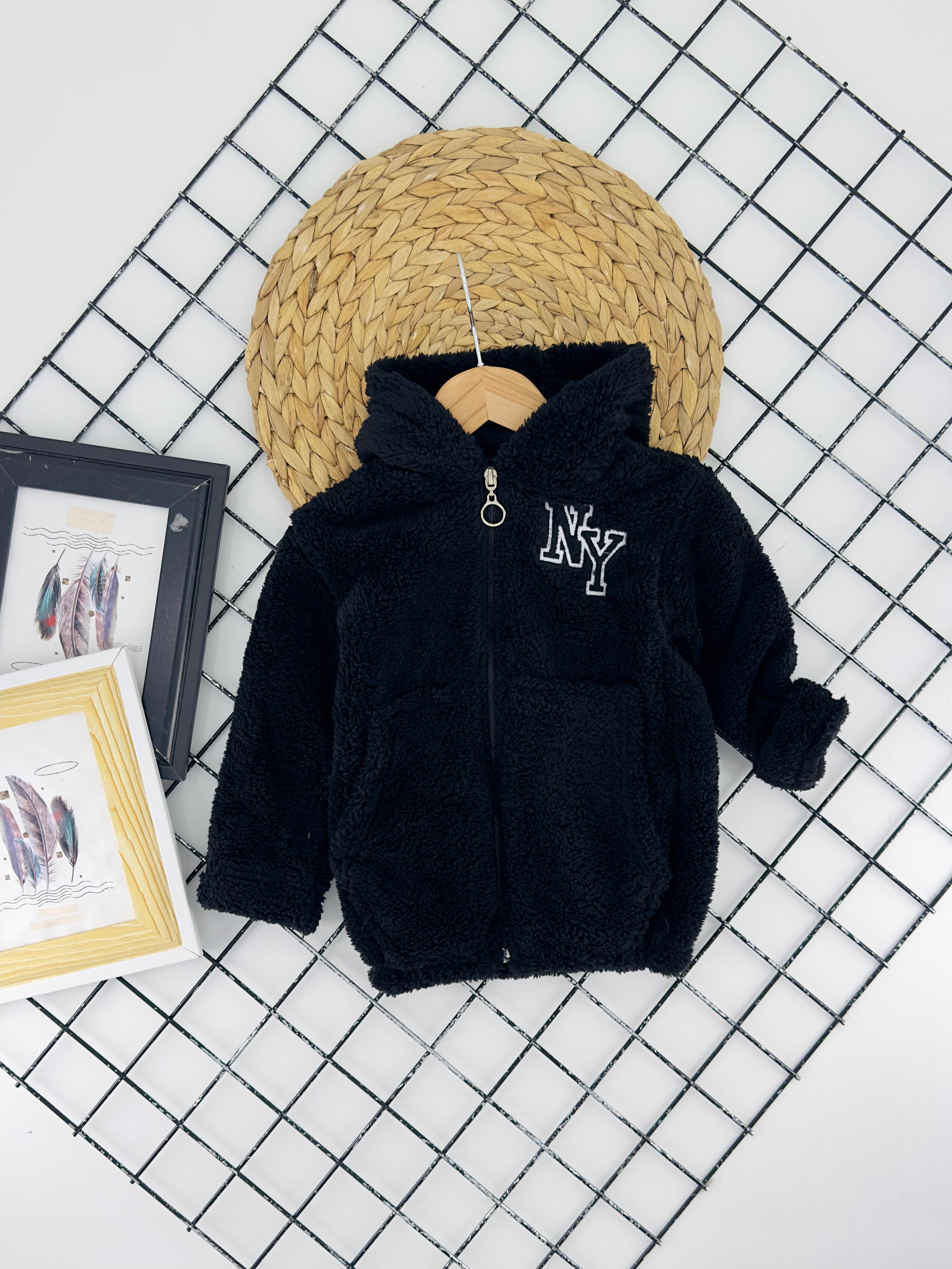 5002-1 Ny Nakışlı Kapşonlur Erkek Çocuk Polar Hırka-SİYAH