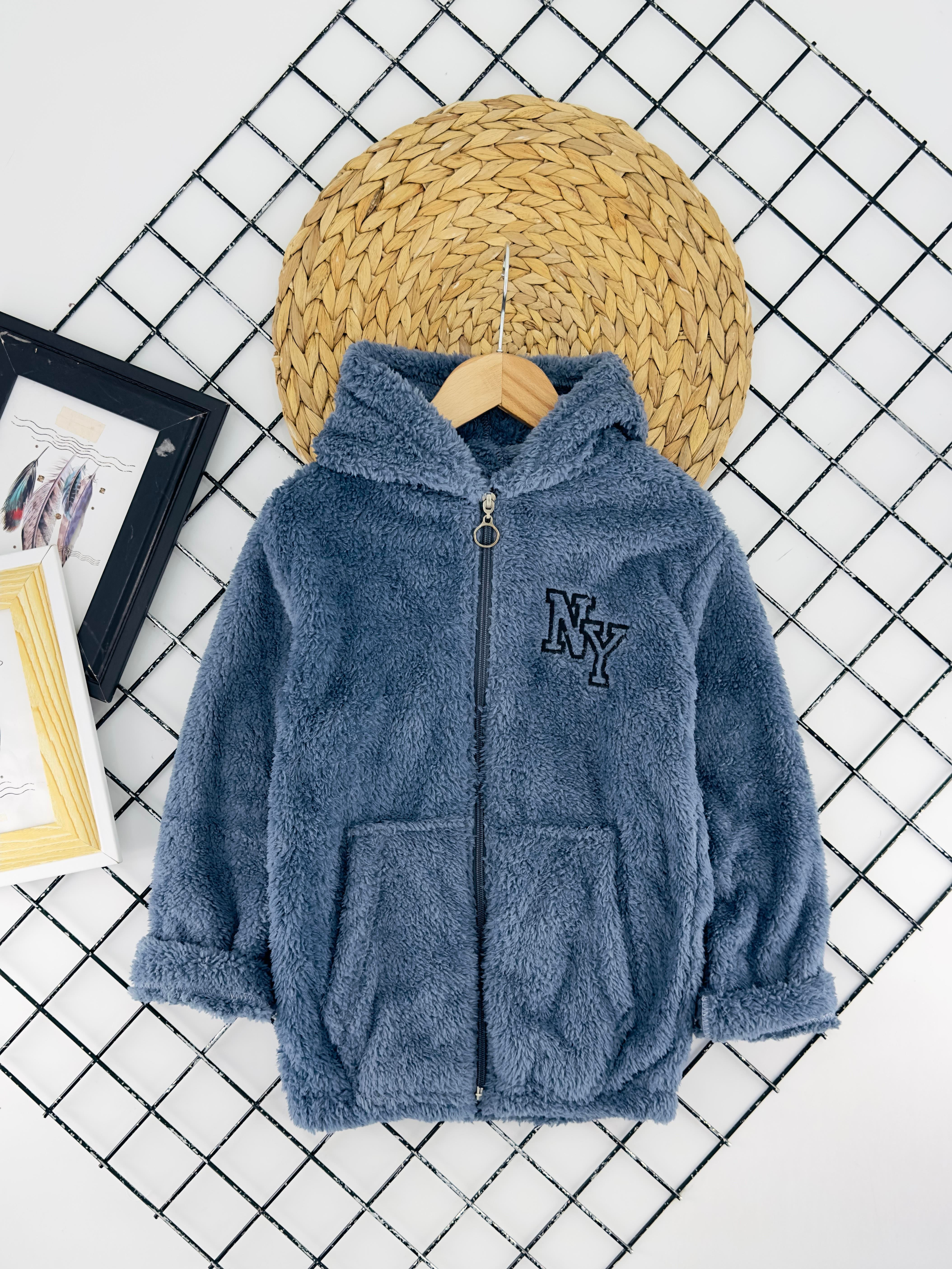 5002-2 Ny Nakışlı Kapşonlu Erkek Çocuk Polar Hırka-MAVİ 5002-2 Ny Nakışlı Kapşonlu Erkek Çocuk Polar Hırka-GRİ