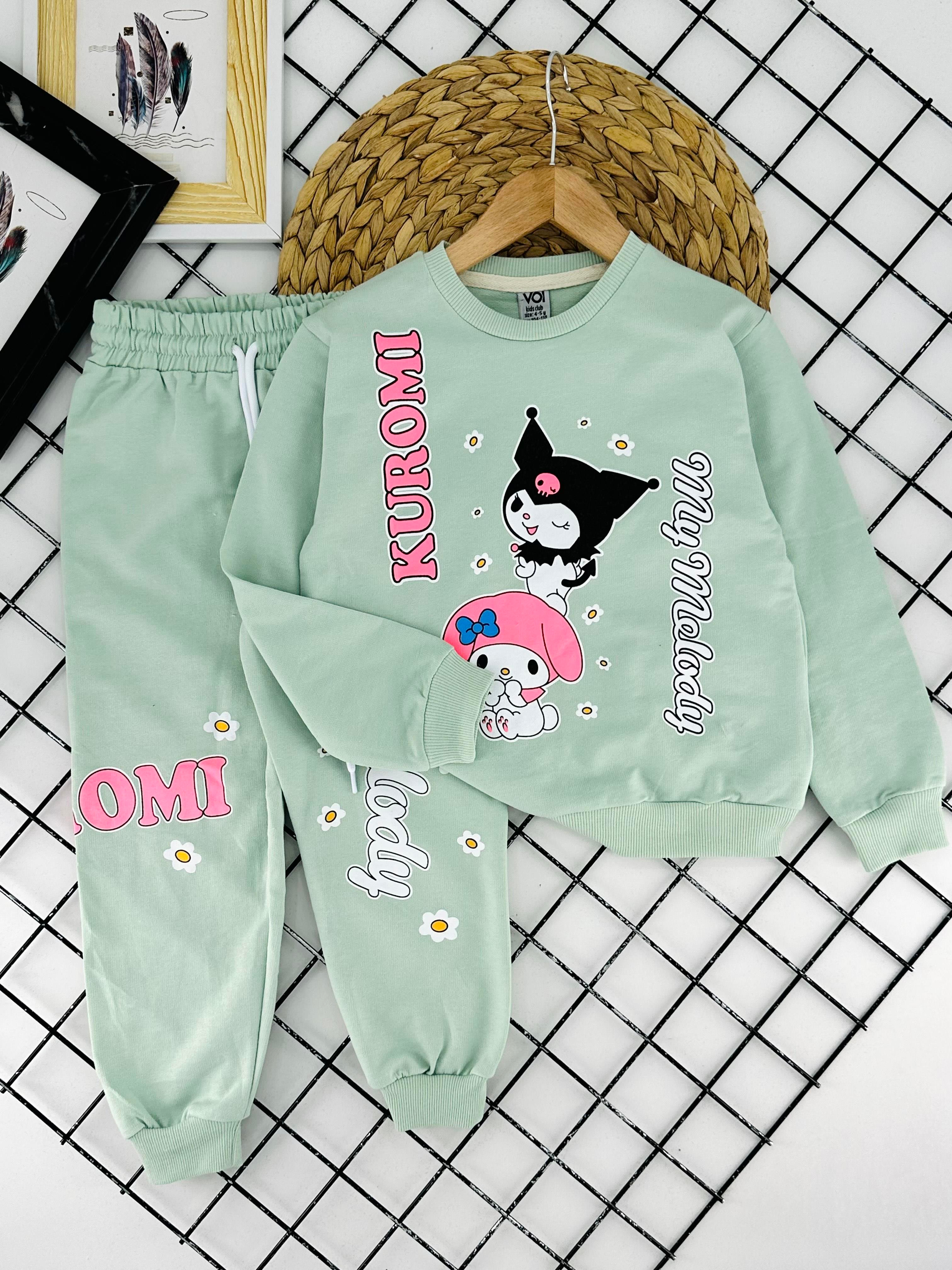 57058 Krm Papatya Baskılı İki İplik Kız Çocuk Penye Takım-SU YEŞİLİ