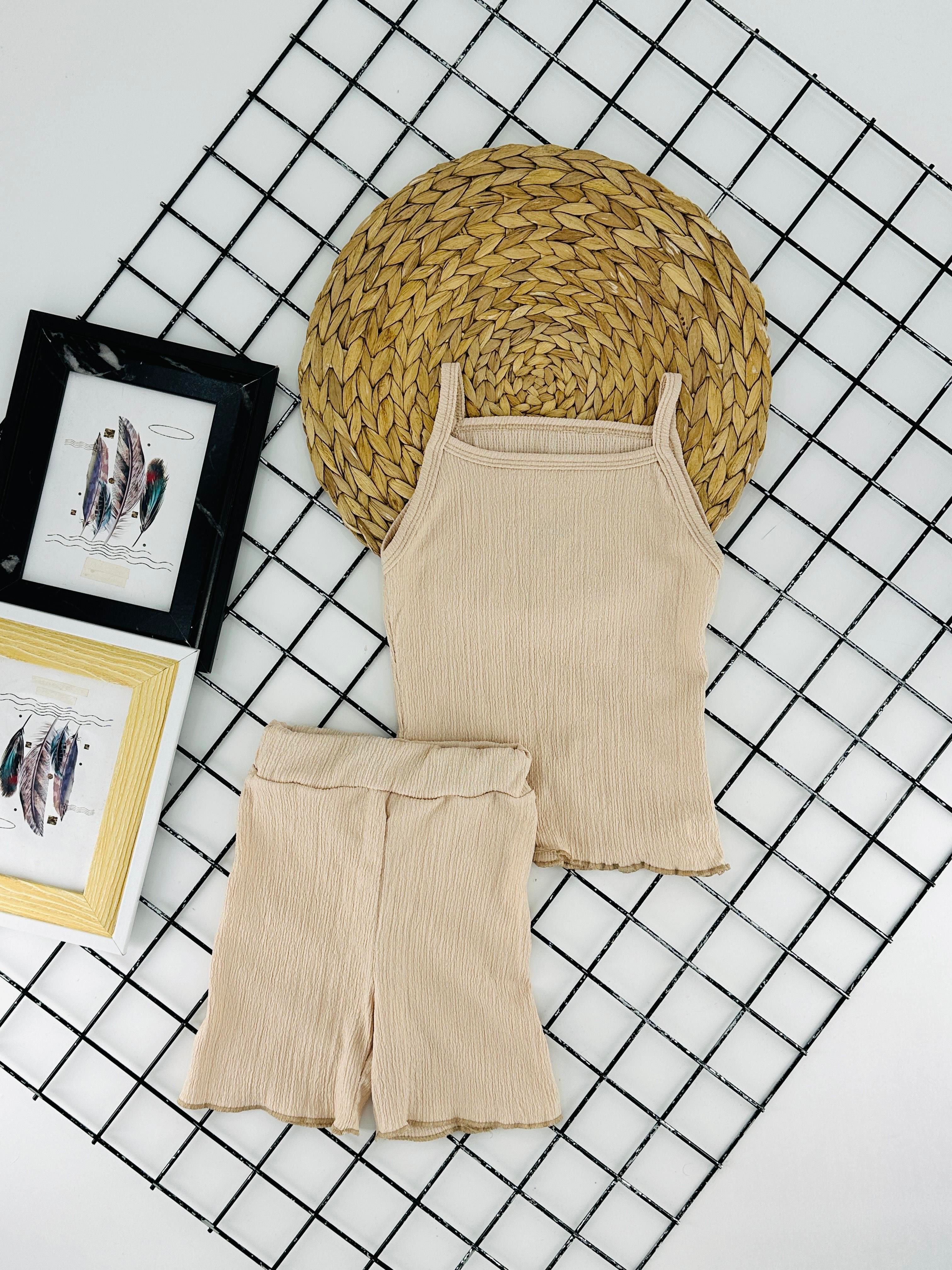 5800-2 İp Askılı Bürümcük Kumaş Kız Çocuk Şortlu Takım-BEJ