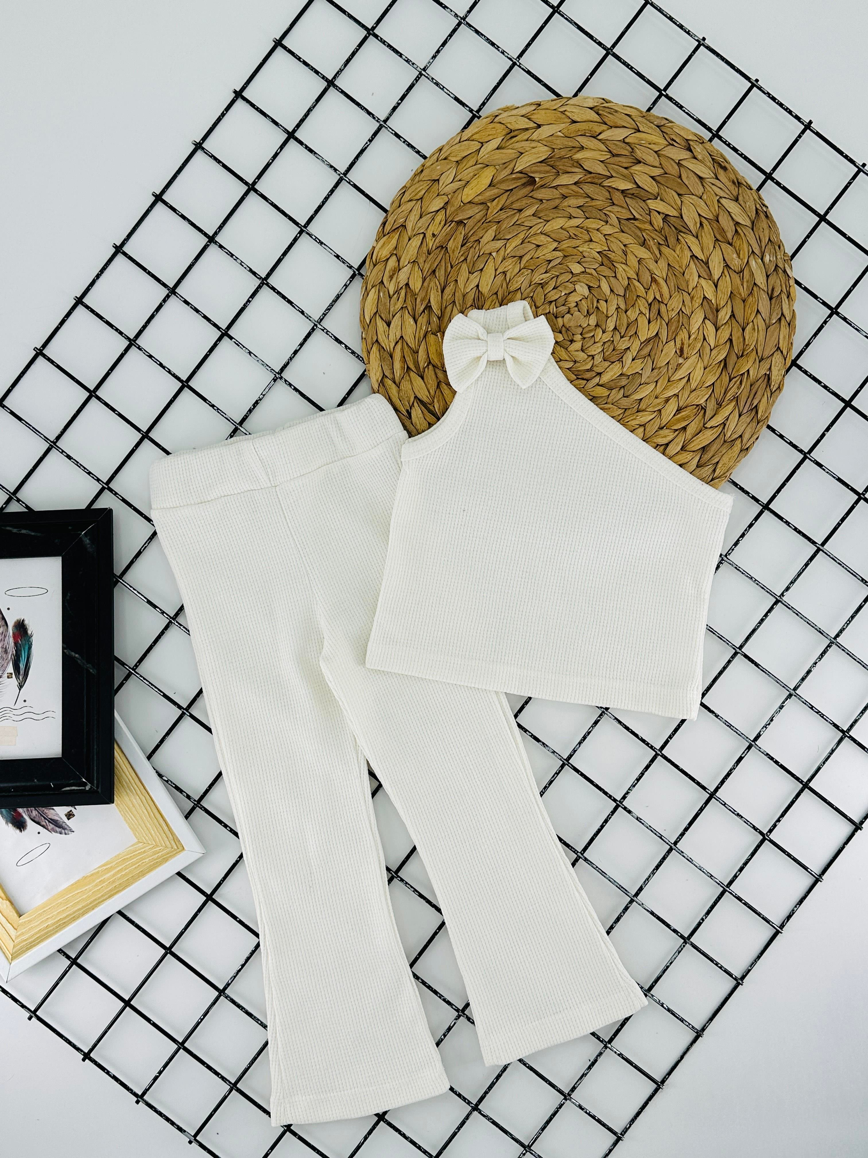 5800-7 Tek Omuz Askılı Waffle Kumaş İspanyol Paça Takım-KREM