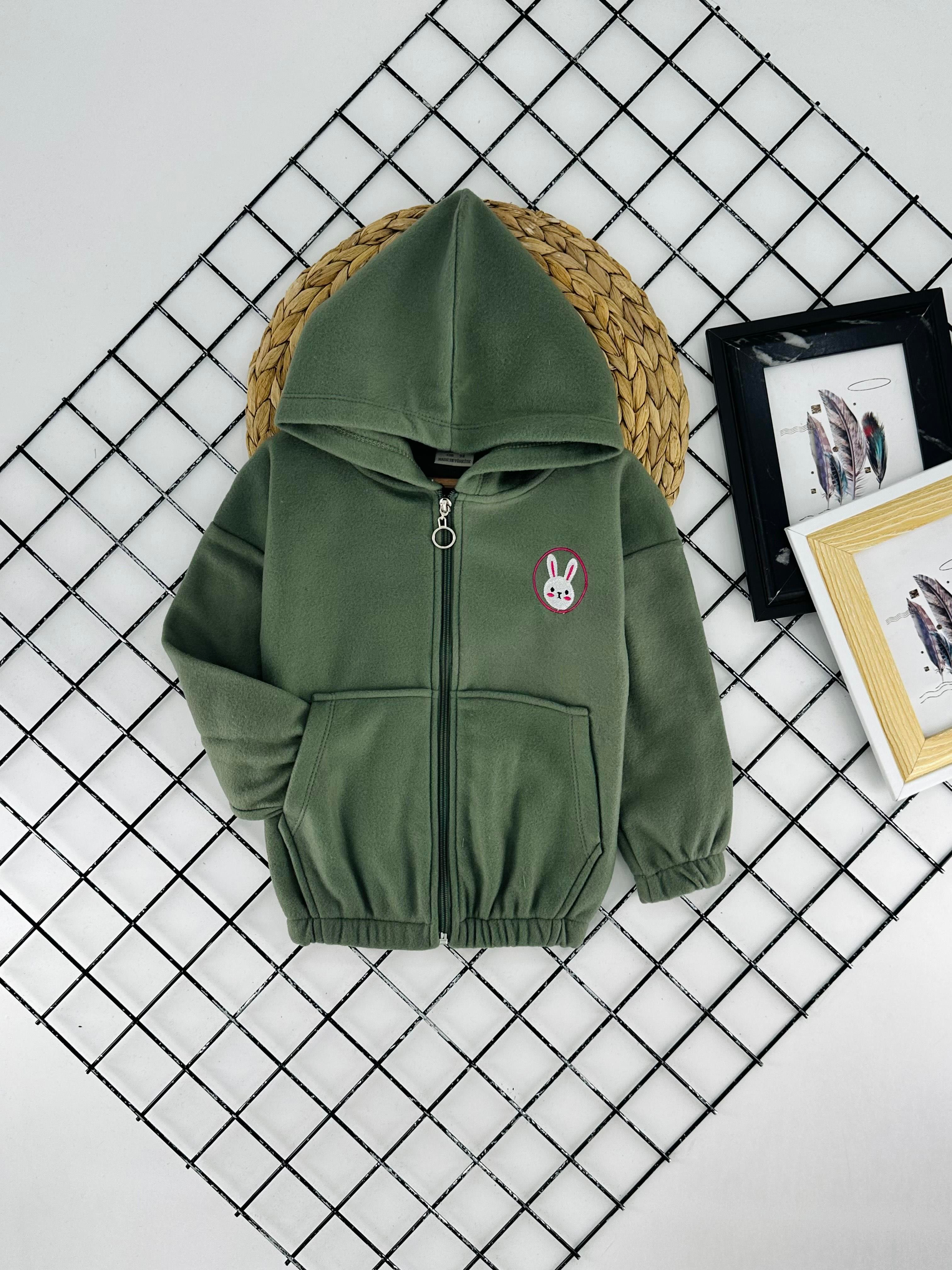 6130 Tavşan Nakışlı Kız Çocuk Polar Hırka-YEŞİL