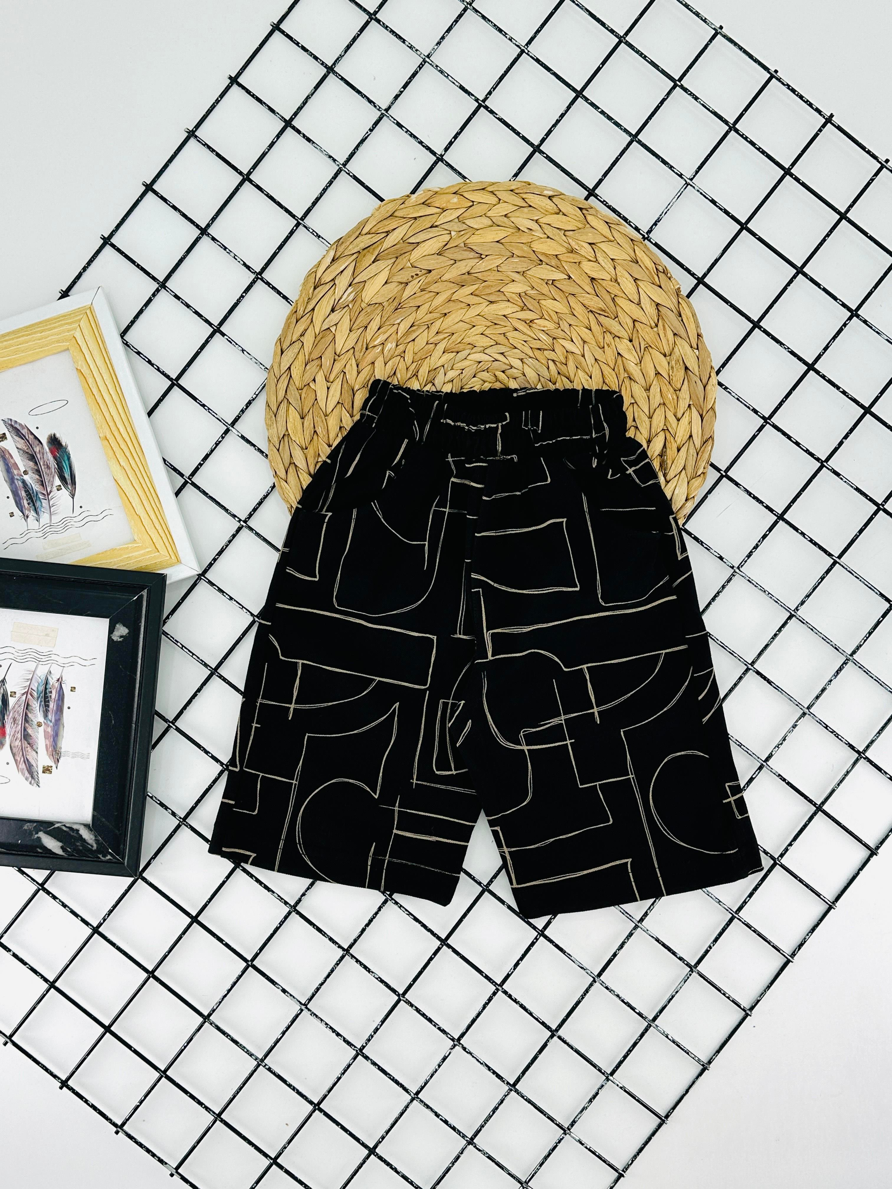 6227-1 Dikdörtgen Çigili Desen Erkek Çocuk Lacost Kumaş Penye Şort-SİYAH