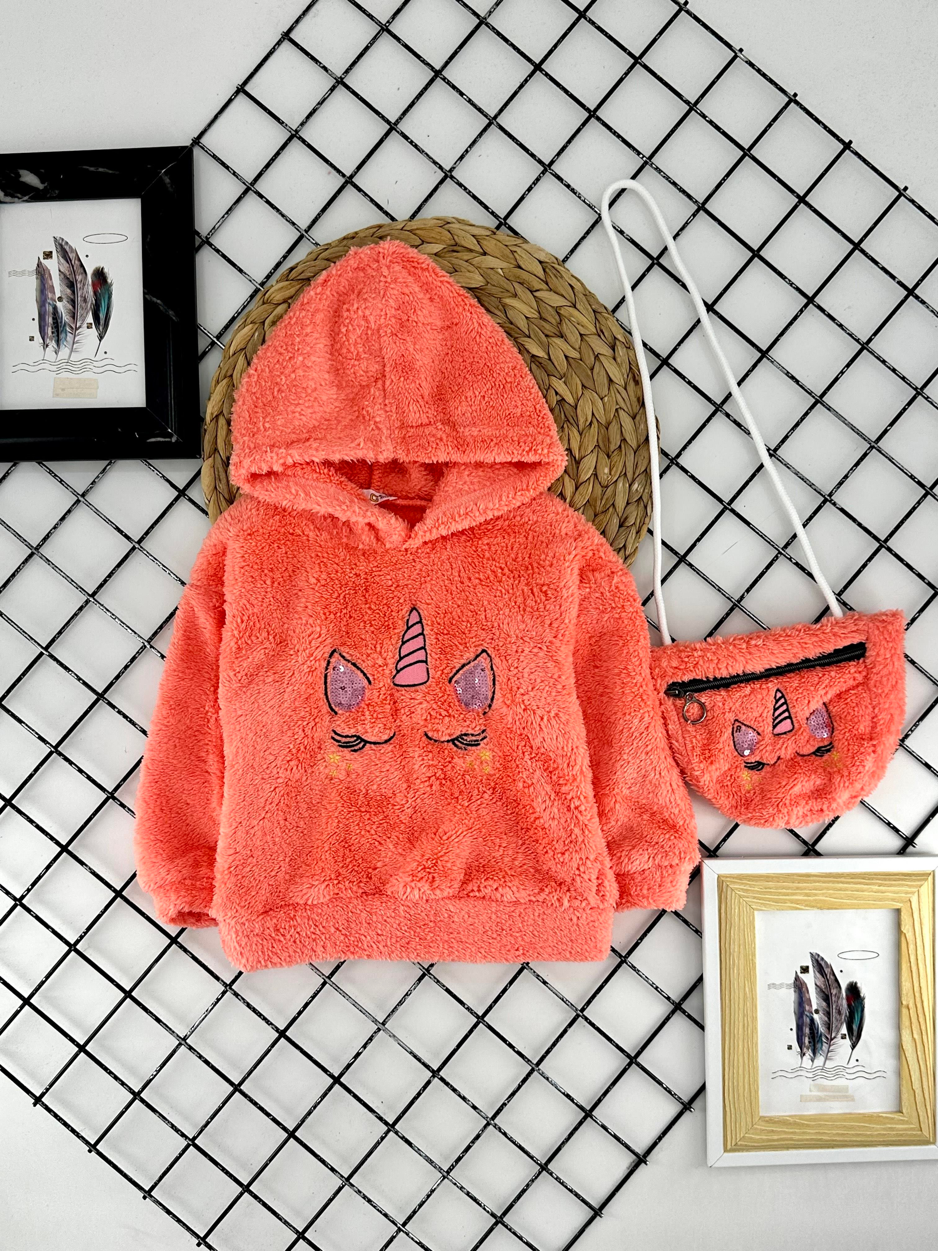 624431 Uncrn Detaylı Çantalı Kız Çocuk  Peluş Hırka-SOMON