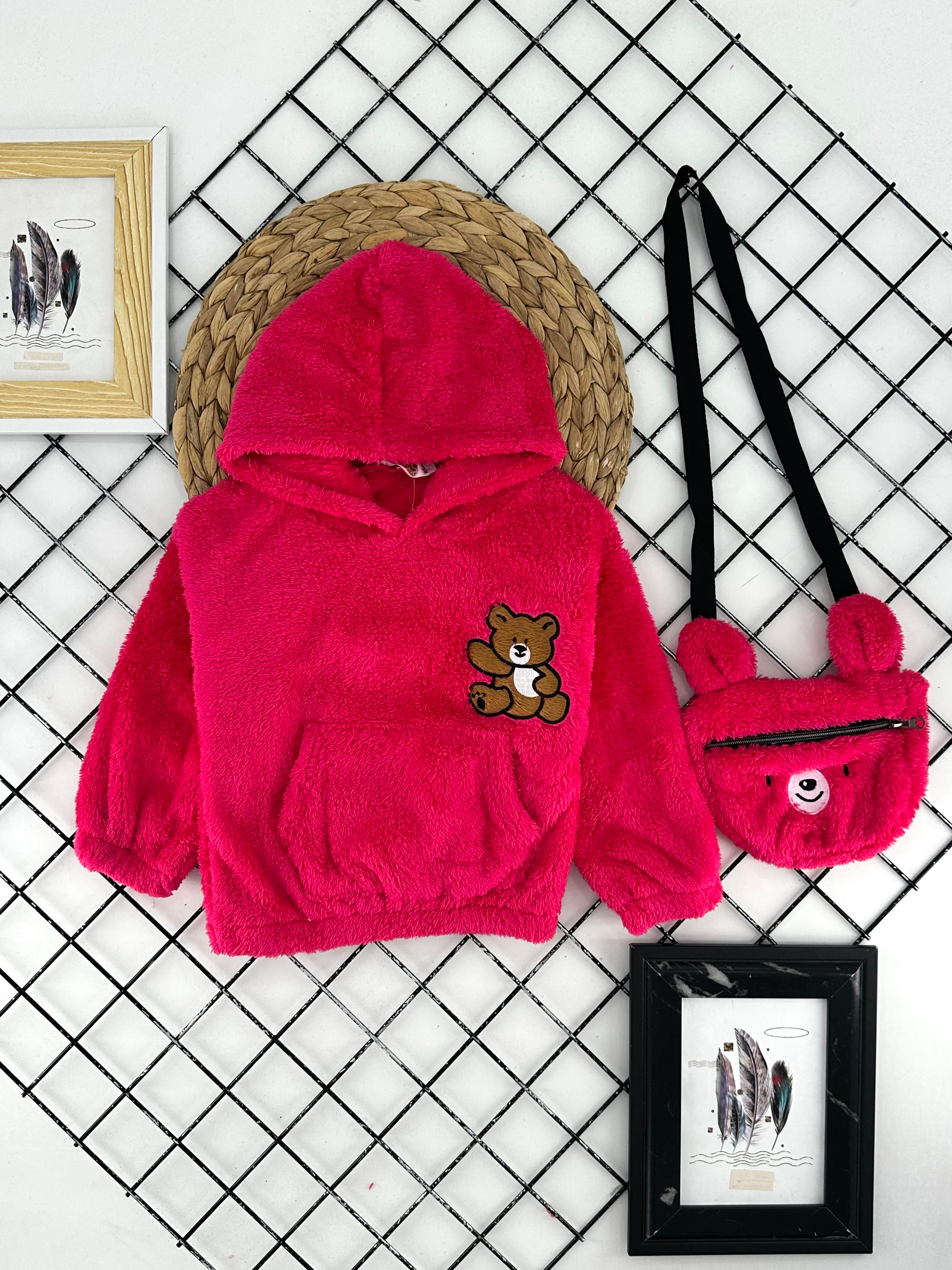 624433 Önü Ayıcık Nakışlı Çantalı Kız Çocuk Peluş Hırka-FUŞYA