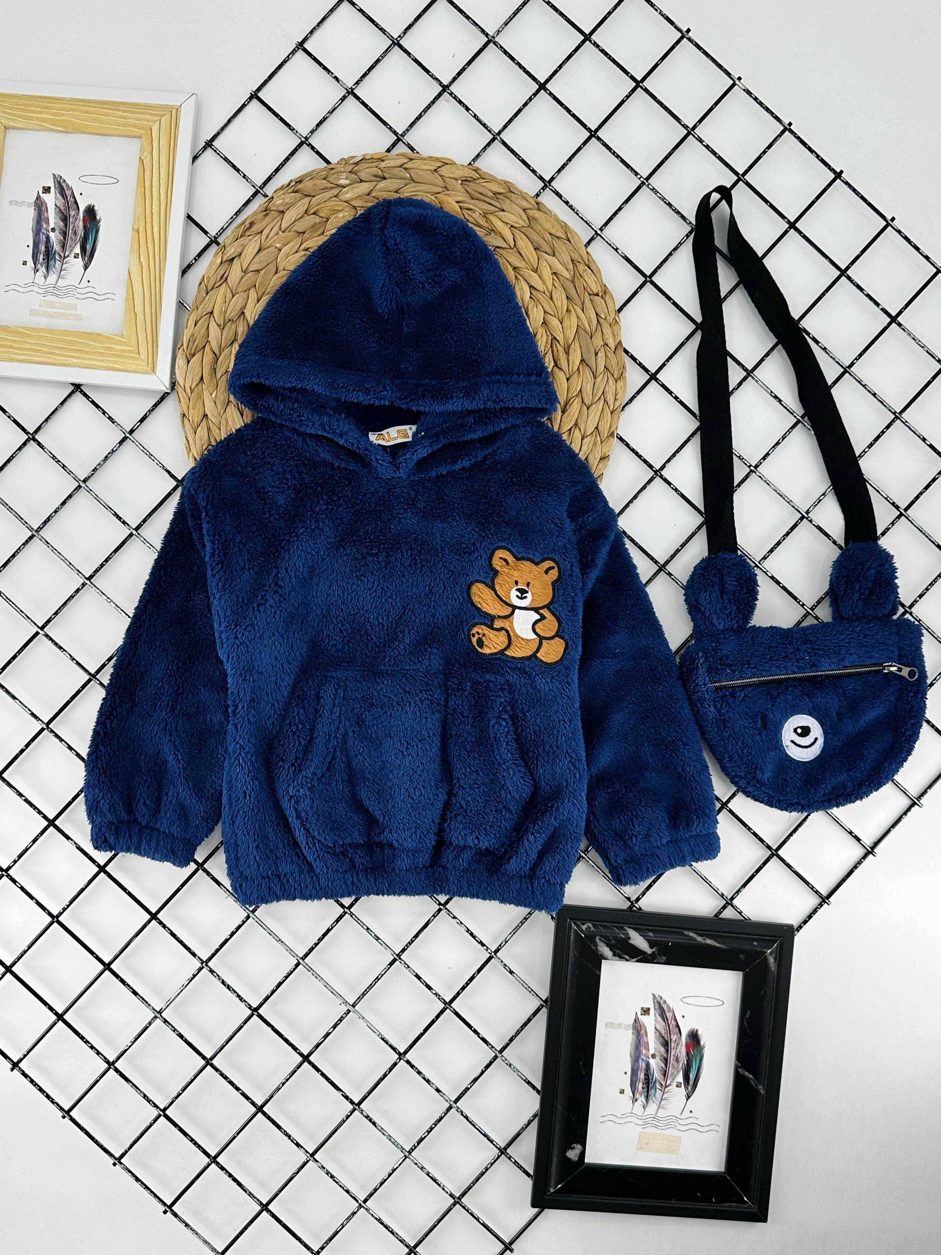 624433 Önü Ayıcık Nakışlı Çantalı Kız Çocuk Peluş Hırka-LACİVERT