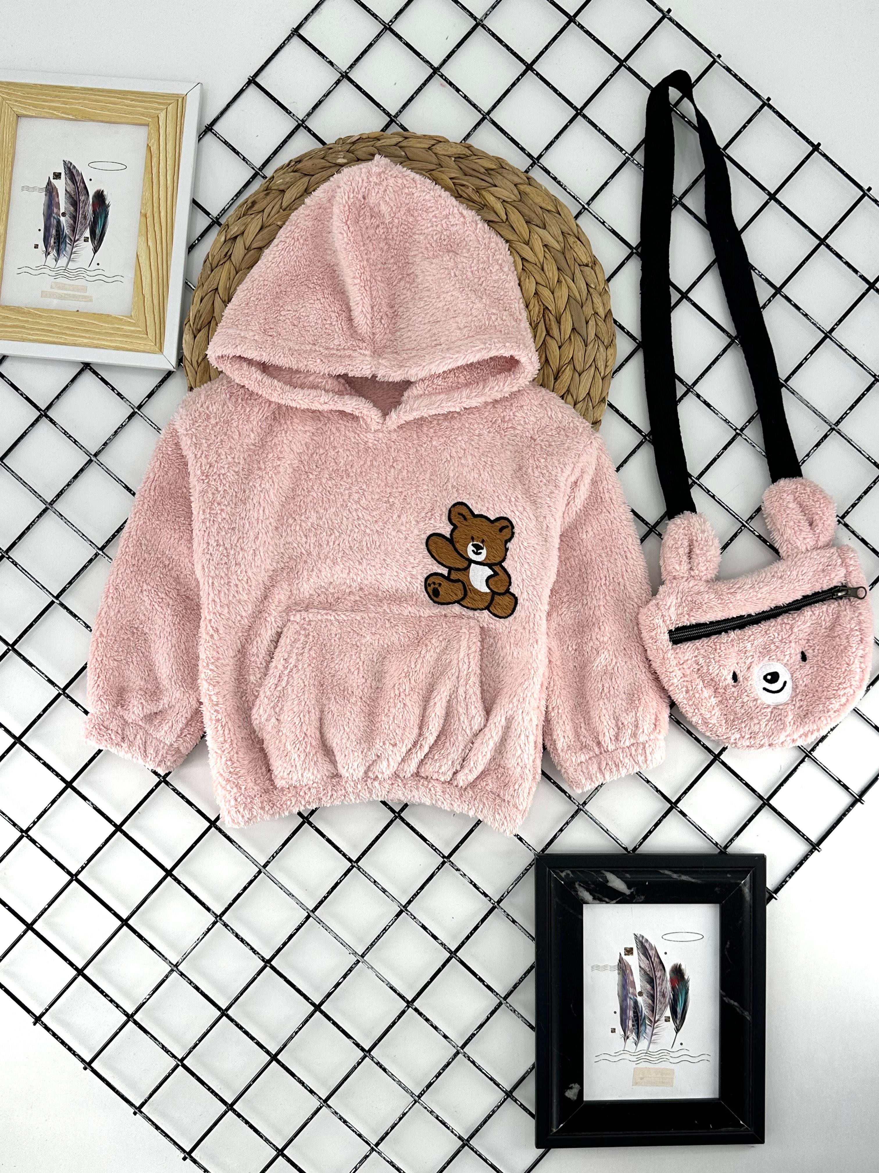624433 Önü Ayıcık Nakışlı Çantalı Kız Çocuk Peluş Hırka-PUDRA