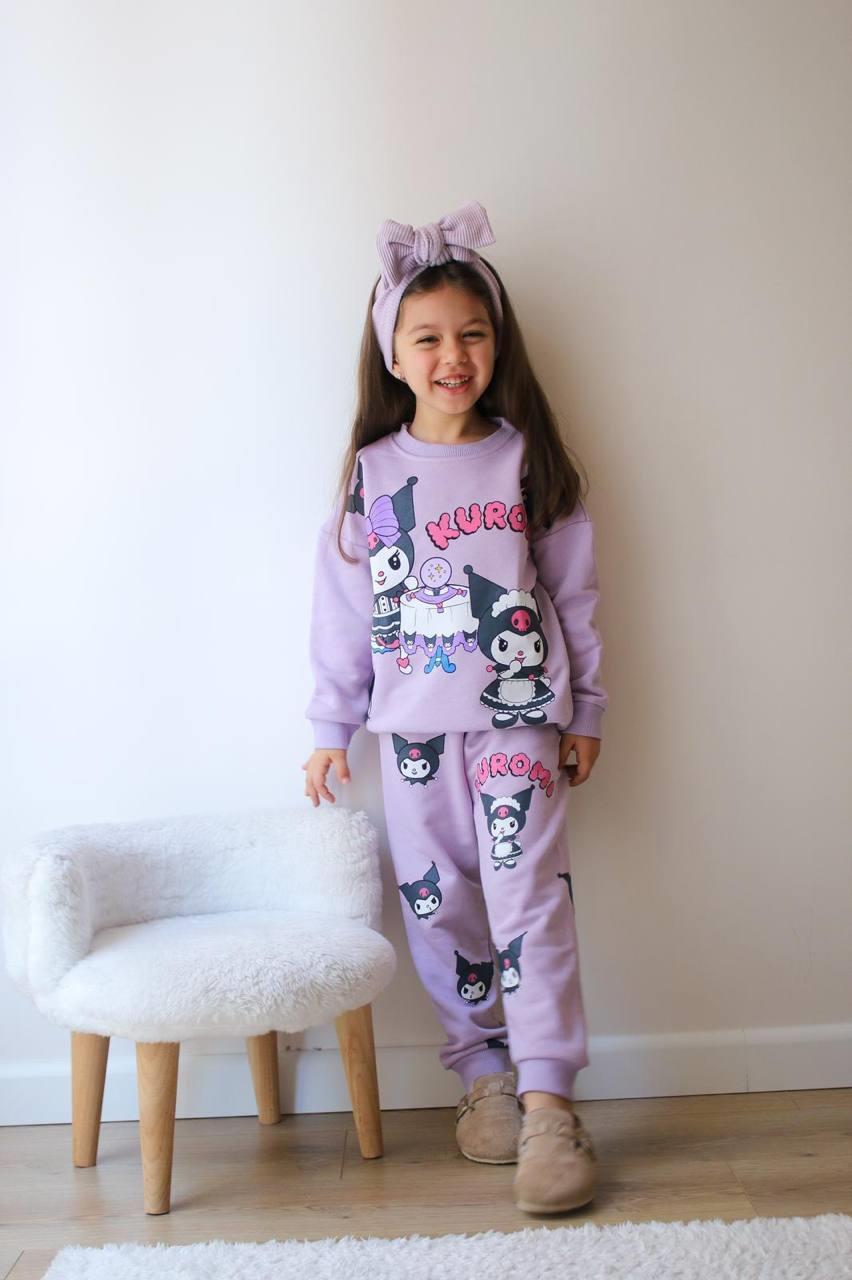 6246 Çoklu Krm Baskılı Yazılı Kız Çocuk Şardonsuz 3 İplik Takım-LİLA