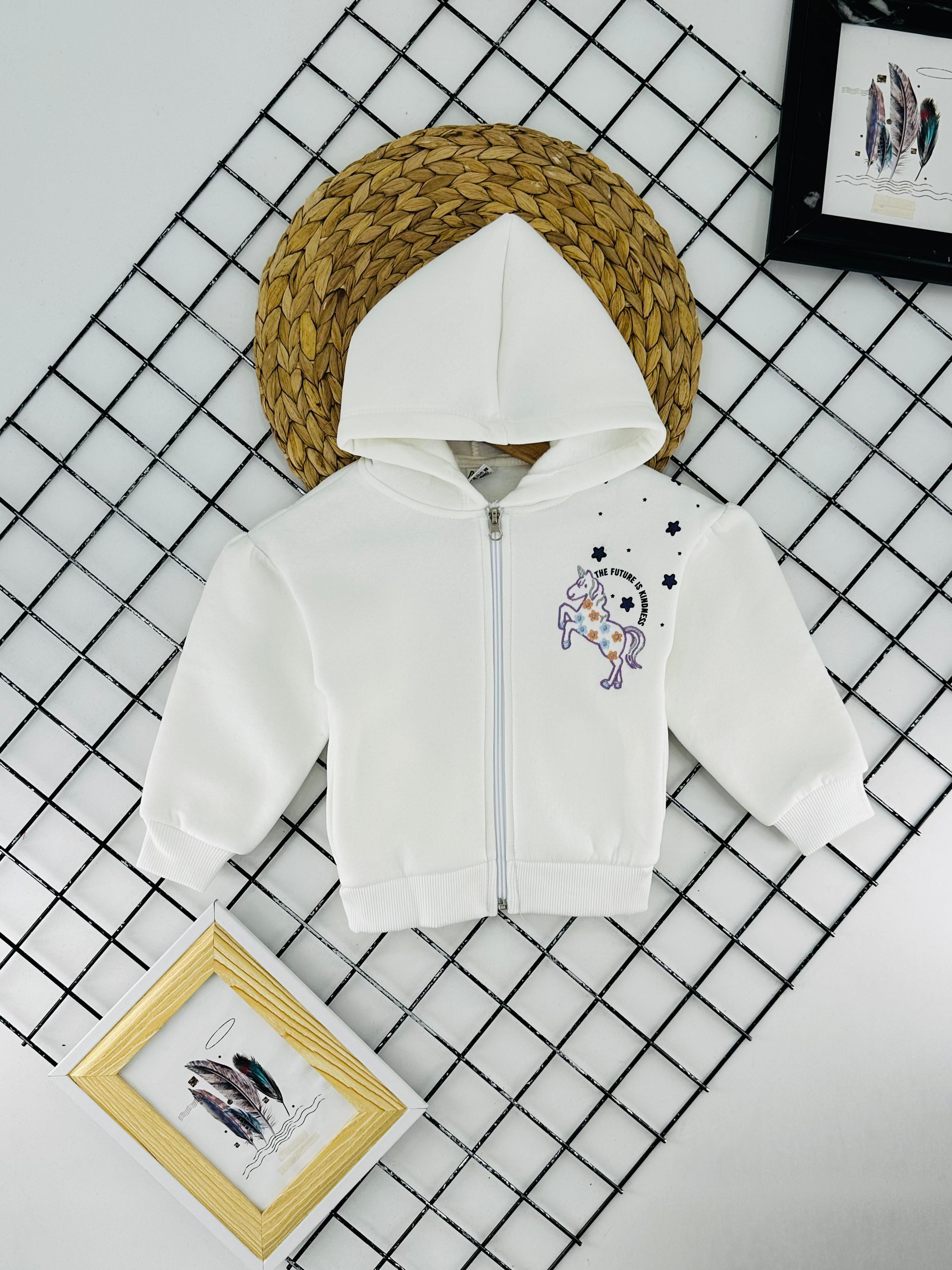 625545 Uncrn Nakışlı Kapşonlu Kız Çocuk Üç İplik Şardonlu Hırka-KREM