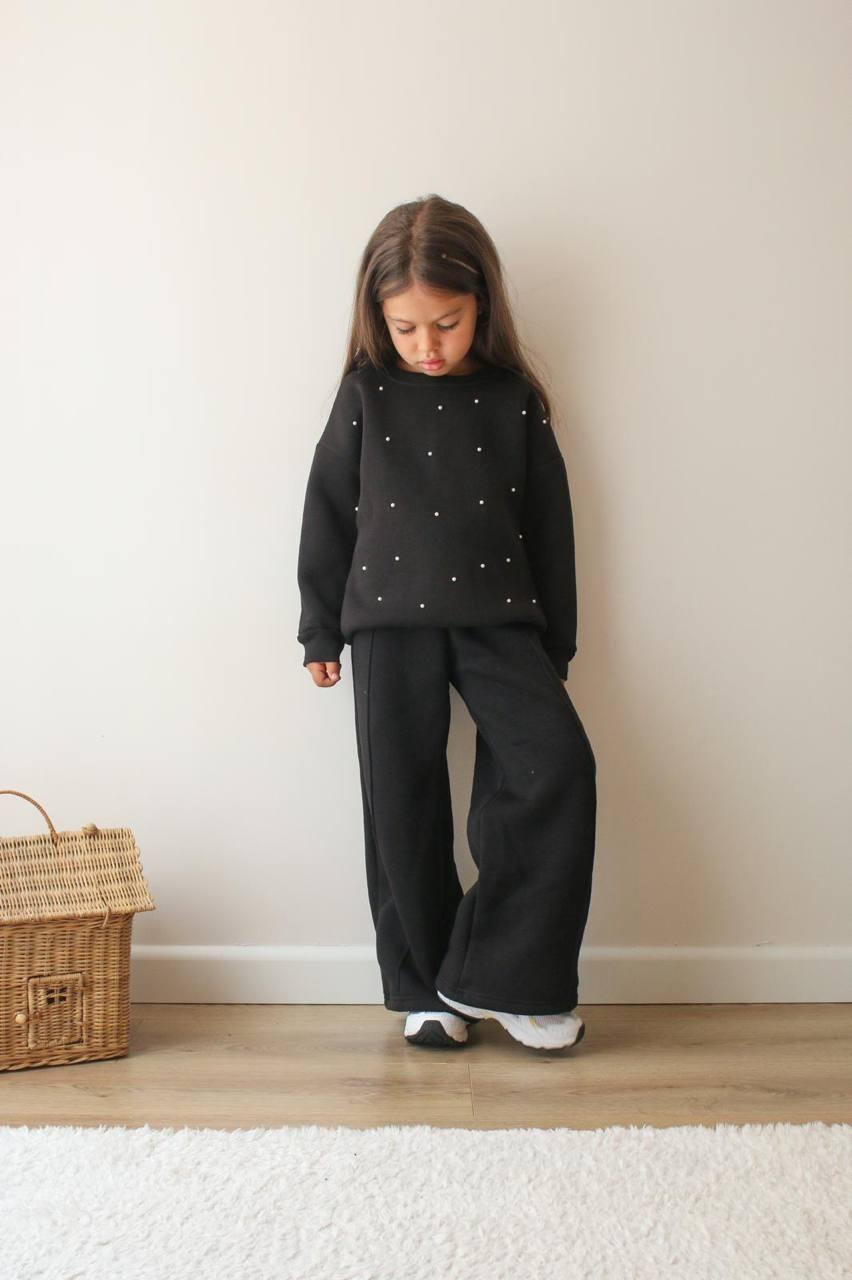 6291 Küçük Boncuk Detaylı Baskılı Kız Çocuk Şardonlu Üç İplik Takım-SİYAH