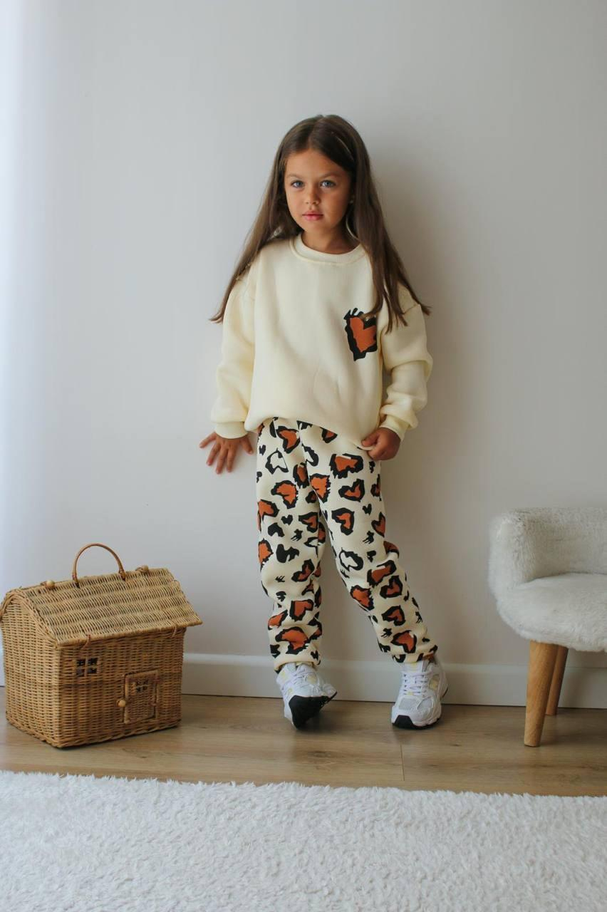 6309 Kalp Baskılı Kız Çocuk Üç İplik Şardonlu Takım-KREM