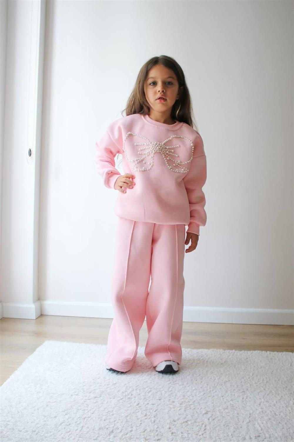 6335 Büyük Boncuklu Fiyonk Detaylı Kız Çocuk Üç İplik Şardonlu Takım-PEMBE