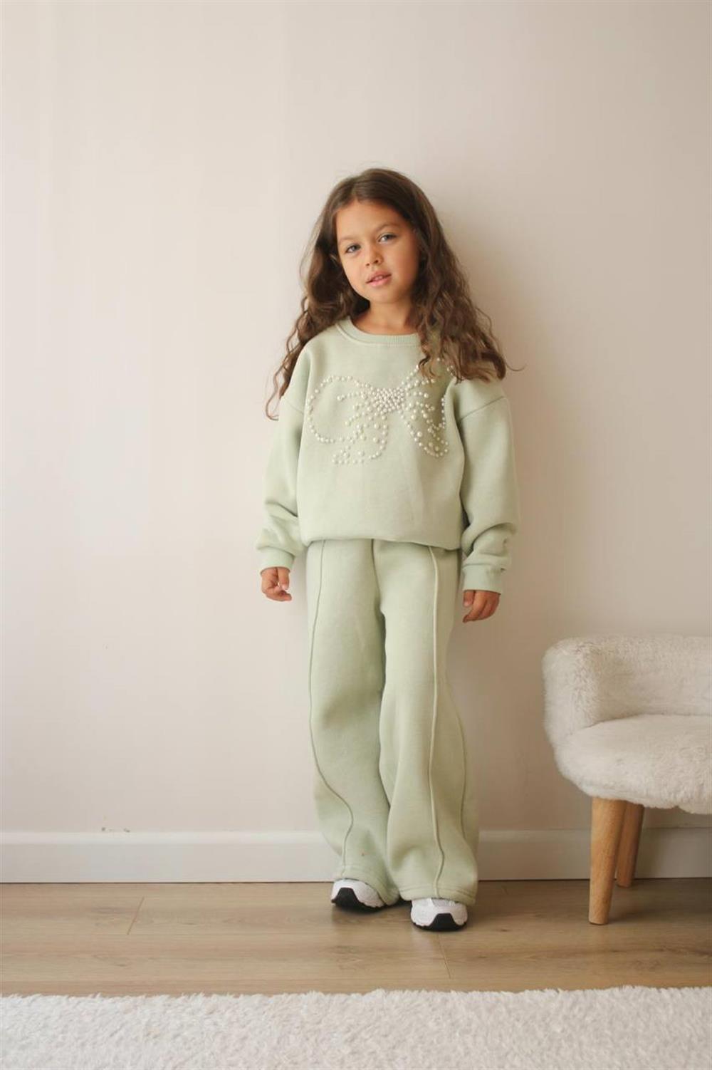 6335 Büyük Boncuklu Fiyonk Detaylı Kız Çocuk Üç İplik Şardonlu Takım-SU YEŞİLİ