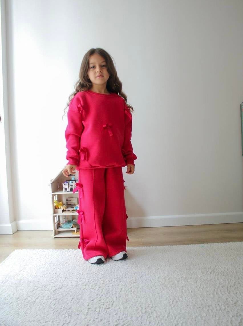 6351 Fiyonk Detaytlı Kız Çocuk Üç İplik Şardonlu Takım-FUŞYA