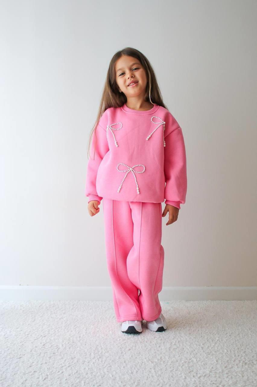 6395 Boncuklu Küçük Fiyonk Detaylı Üç İp Şardonlu Kız Çocuk Takım-PEMBE