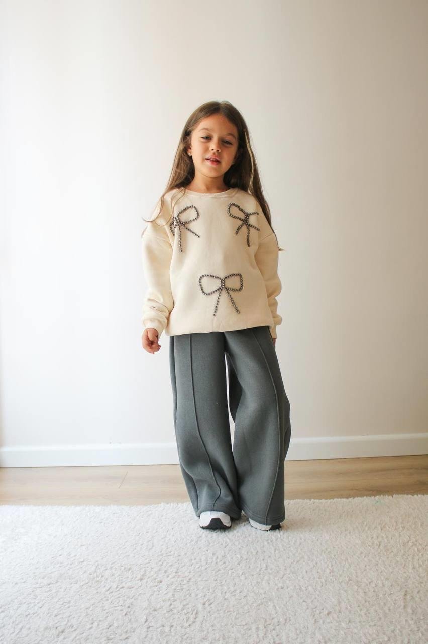 6401 Boncuklu Kurdale Detaylı Üç İp Şardonlu Kız Çocuk Takım-KREM