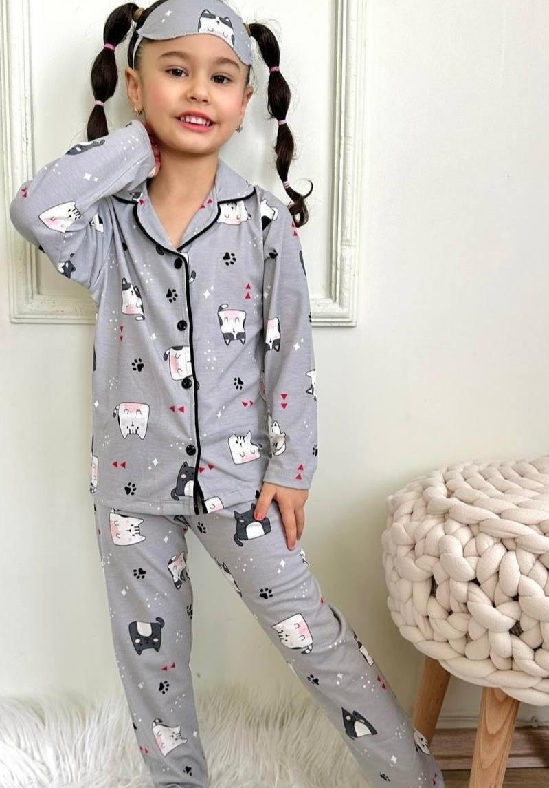 6666-5 Kedi Pati Baskılı Kız Çocuk Pijama Takım-GRİ