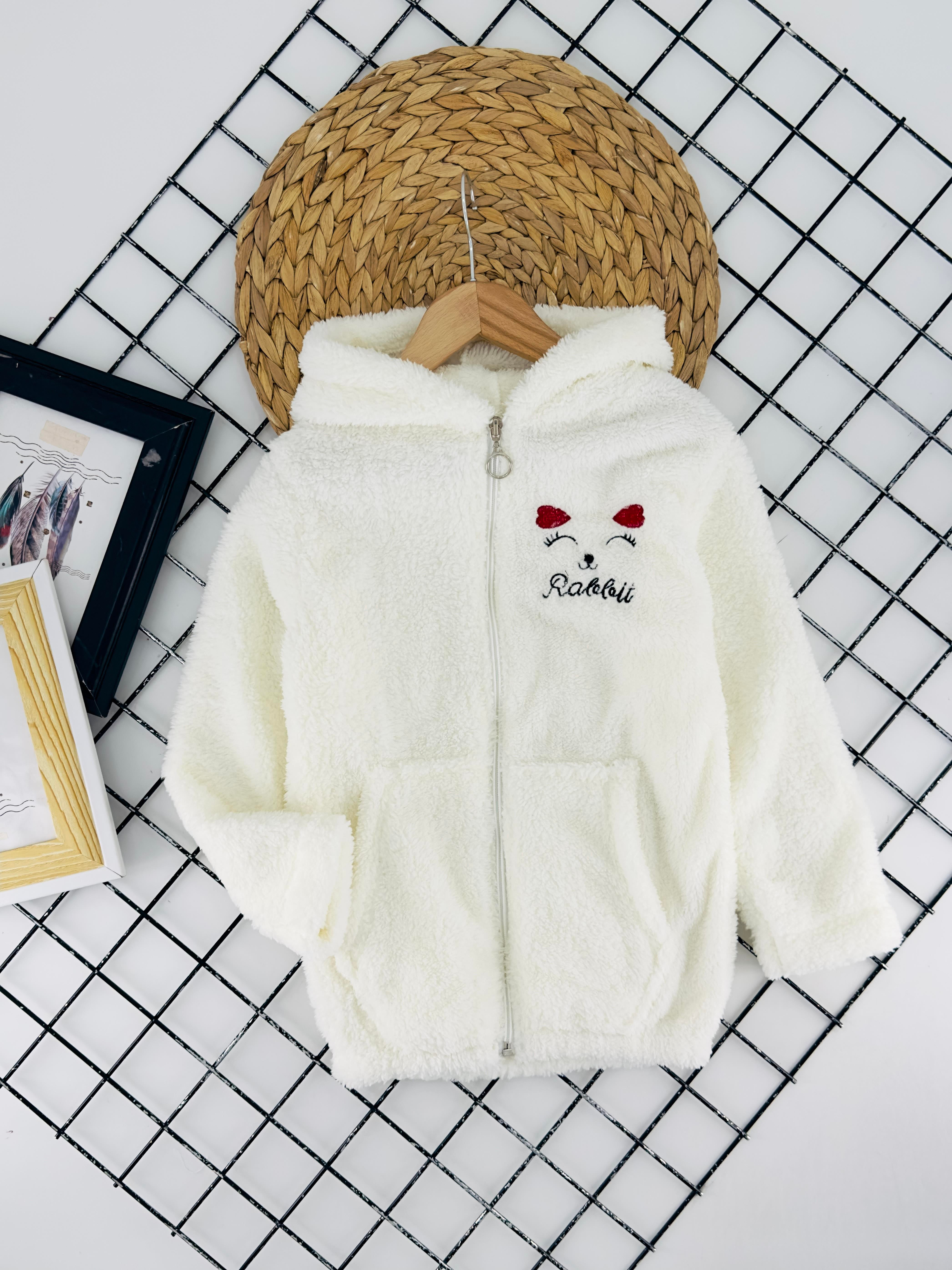 690-1 Kedi Nakışlı Kapşonlu Kız Çocuk Polar Hırka-KREM