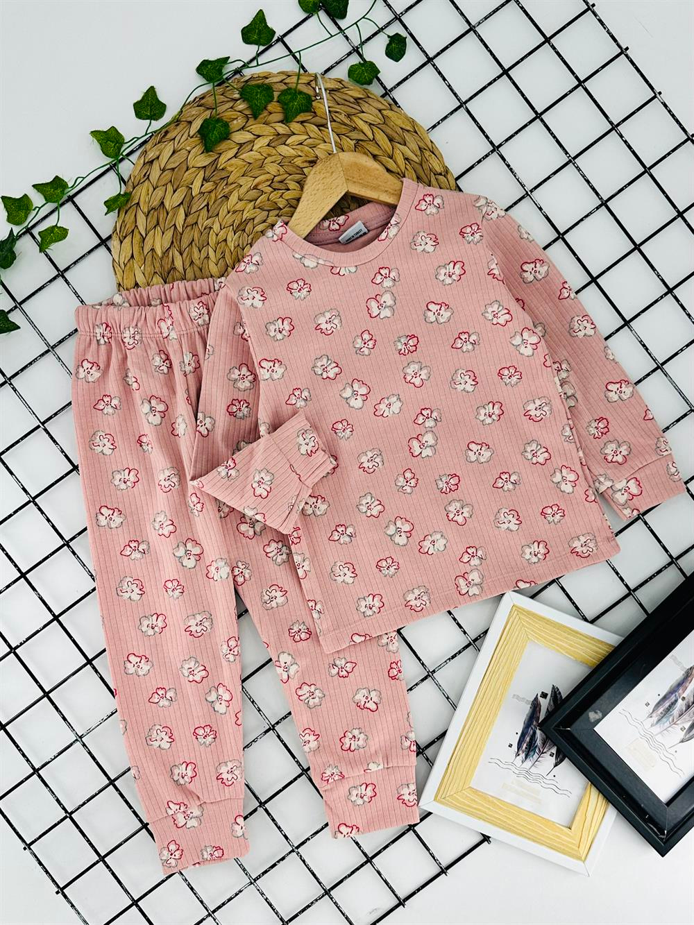 7136-1 Büyük Papatya Baskılı Kız Çocuk Fitilli Kumaş Takım-GÜL KURUSU