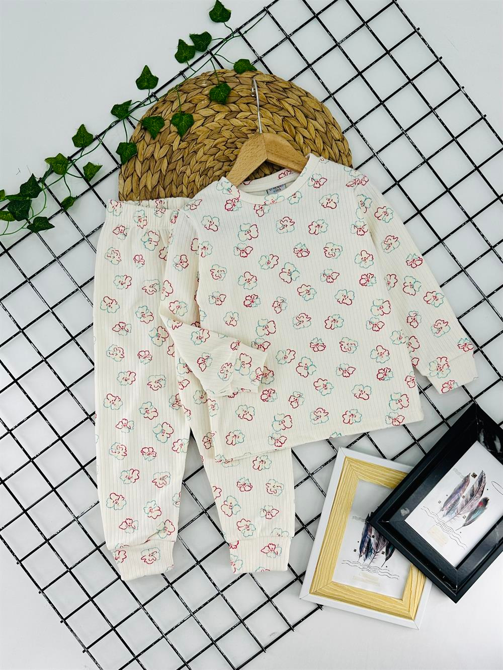 7136-1 Büyük Papatya Baskılı Kız Çocuk Fitilli Kumaş Takım-KREM